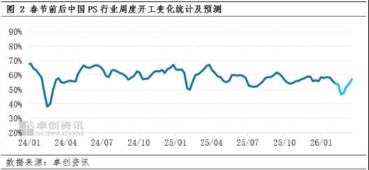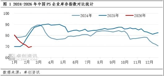 | 【导语】行业成本压力居高不下,但企业积极交付前期订单,春节前PS行业开工保持年内中高位;进入2月,生产企业降负意向显现,且本周内降负集中,预计春节假期期间行业开工负荷下降至43%。春节后,随着下游复工复产,国内PS行业复工节奏或谨慎乐观。 积极交付订单 企业阶段性去库 2026年1-2月,大宗商品整体表现良好,国内PS市场亦呈现稳步攀升的态势,与2025年四季度的预测趋势呈现出一定的偏差,因此1-2月国内PS生产企业积极交付前期因预期累库而预售的订单,部分生产企业实现阶段性去库。据卓创资讯监测数据显示,截至2026年2月初,国内PS行业样本企业的库存指数下降至约69,一度下降至三年来同期低位水平。