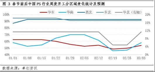 累库压力 主产销区开工波动明显 从图3中PS行业周度开工区域统计来看,春节前后东北、西北等地区大型炼化企业配套装置开工波动有限,主产销区华东及华南地区开工波动较为明显。原料苯乙烯行业盈利良好,华东区域部分规模企业PS阶段性降低开工负荷,因此1月中旬以来,华东PS开工负荷呈现震荡小幅下滑的趋势,预计假期期间区域PS开工下降至48%-49%,随着年后复工复产,开工负荷震荡恢复。华南地区作为PS的第二大产销区,春节前后的开工波动尤其明显。预计假期期间,华南PS开工负荷下降至45%-46%,节后1-2周时间,区域开工预计恢复至6成上下的水平。