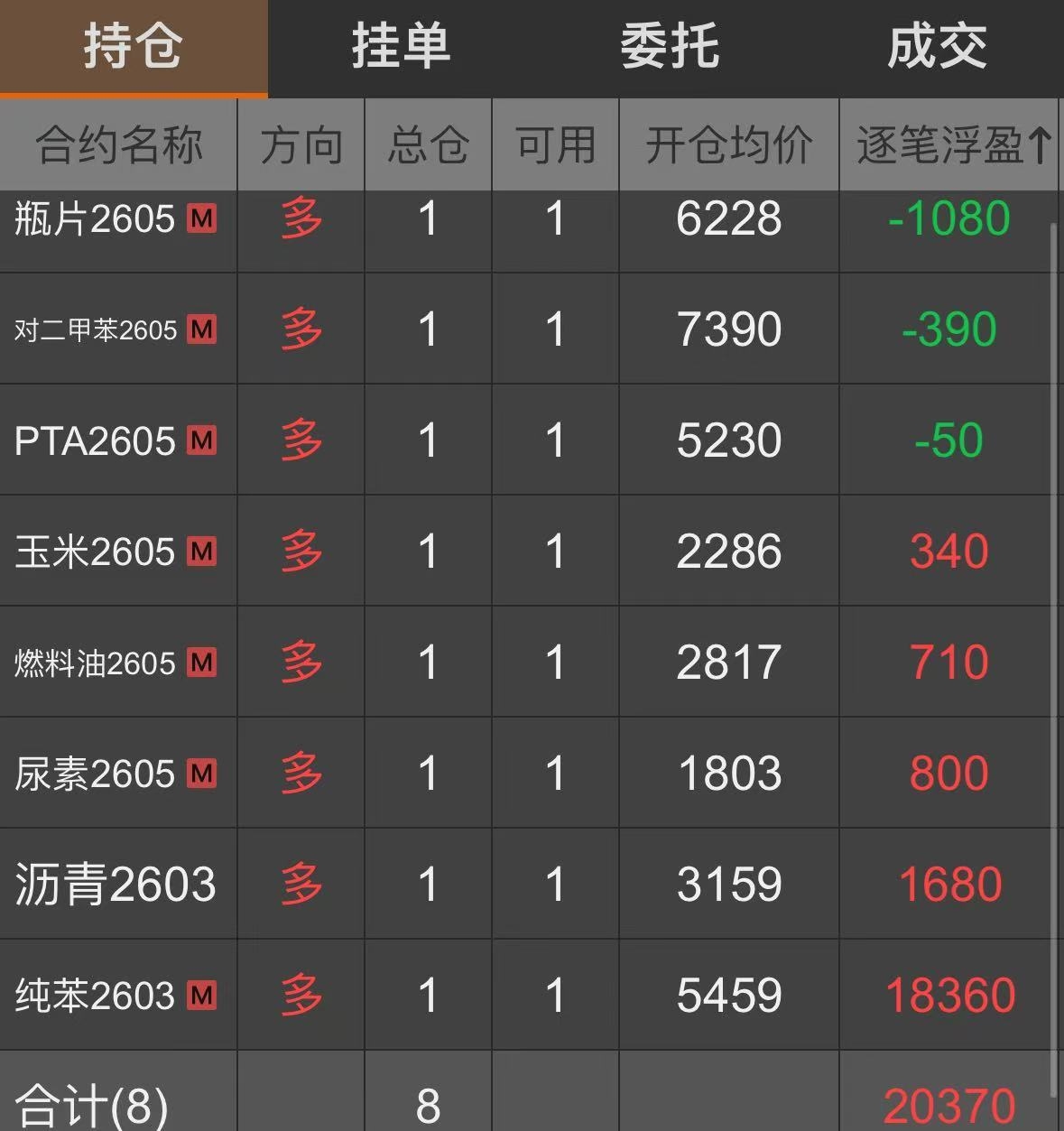 | 一、开仓总结 沥青:2025年12月17日,达到启动点的开仓条件,所以在14:52开多一手沥青2602合约,开仓价为2995。沥青2602合约于2026年1月6日21:17移仓至主力合约2603,开仓价为3159。 纯苯:2026年1月7日,达到启动点的开仓条件,所以在14:54开多一手纯苯2603合约,开仓价为5459。 燃料油:2026年1月9日,达到启动点的开仓条件,所以在14:56开多一手燃料油2603合约,开仓价为2514。燃料油2603合约于2026年2月5日21:35移仓至主力合约2605,开仓价为2817。 PTA:2026年2月10日,达到启动点的开仓条件,所以在14:53开多一手PTA2605合约,开仓价为5230。 玉米:2026年2月10日,达到启动点的开仓条件,所以在14:53开多一手玉米2605合约,开仓价为2286。 对二甲苯:2026年2月11日,达到启动点的开仓条件,所以在14:40开多一手对二甲苯2605合约,开仓价为7390。 尿素:2026年2月11日,达到启动点的开仓条件,所以在14:42开多一手尿素2605合约,开仓价为1803。 瓶片:2026年2月11日,达到启动点的开仓条件,所以在14:43开多一手瓶片2605合约,开仓价为6228。 二、平仓计划 沥青:达到启动点的平仓止损/止盈条件,在收盘前或下一个交易日开盘后全部平仓。 纯苯:达到启动点的平仓止损/止盈条件,在收盘前或下一个交易日开盘后全部平仓。 燃料油:达到启动点的平仓止损/止盈条件,在收盘前或下一个交易日开盘后全部平仓。 PTA:达到启动点的平仓止损/止盈条件,在收盘前或下一个交易日开盘后全部平仓。 玉米:达到启动点的平仓止损/止盈条件,在收盘前或下一个交易日开盘后全部平仓。 对二甲苯:达到启动点的平仓止损/止盈条件,在收盘前或下一个交易日开盘后全部平仓。 尿素:达到启动点的平仓止损/止盈条件,在收盘前或下一个交易日开盘后全部平仓。 瓶片:达到启动点的平仓止损/止盈条件,在收盘前或下一个交易日开盘后全部平仓。 注:本交易总结由第三方提供,只作为投资理念和方法的交流,不作为七禾网的观点,也不作为投资参考和建议。 附: 1、交易者简介 十年股票/期货/外盘交易经验,每年都实现投资盈利。 擅长微观盘面分析和宏观市场分析,总结了数套有效的盈利模式,和众多高手有深入交流,收益良好。 2、持仓截图