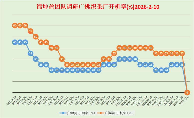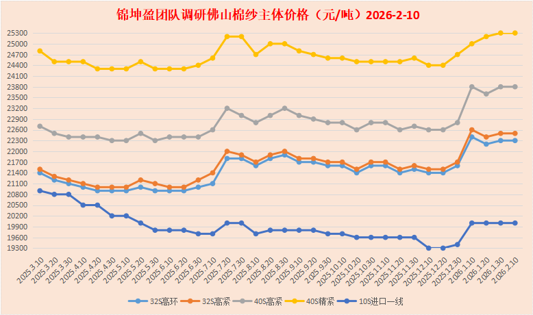 10、纺纱厂:纺纱厂两极分化,质量优秀的纺纱厂,纺特殊定制品种的纺纱厂生意挺好,一直在交客户长期定单,有的排期都到4月尾了,其他的大部分纺纱厂生意一般。纺纱厂对后市整体信心缺乏,原料备货积极性不高,随用随买原则,逢低补库,刚需采购。纺纱厂一般在农历廿四到廿六放假。 11、出口:中美关税政策虽有改善,纺织服装出口数据仍起色不大。 12、国内需求:国家多部门联动,推动国内大市场建设,财政金融多举措政策,强力刺激消费拉动内需,2026年内销市场值得期待。 13、棉纱价格:棉纱基本维持上月底价格。当前佛山市场现金含税主流报价,国产牌子货纯棉32支高配环纺22100~22300元/吨,纯棉32支高配紧密22200~22500元/吨,纯棉40支高配紧密23500~23800元/吨,纯棉40支精梳紧密25000~25300元/吨,进口一线纯棉10支赛络散货20000元/吨,整柜优惠100元/吨。高支纱50支,60支价格仍有部分上调,50支供应偏紧,60支稍有松动。
