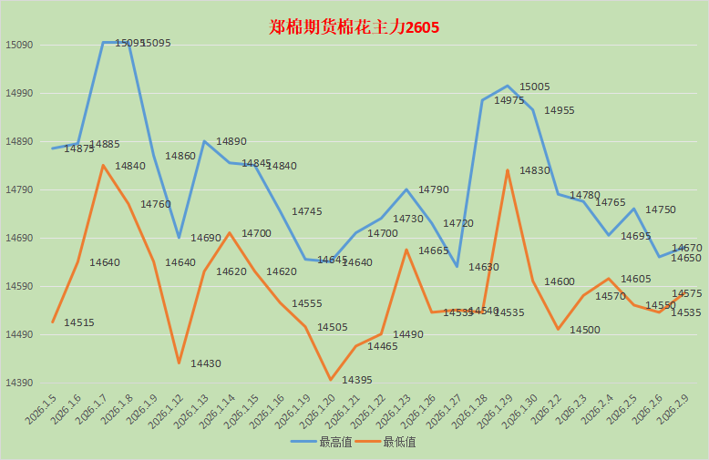 9、棉花:郑棉CF2605主力合约在14500~14695之间震荡,预计短期内仍以区间震荡为主。新棉加工基本完成,市场供应充足,棉花加工企业陆续顺价销售,经营整体处于盈利状态。