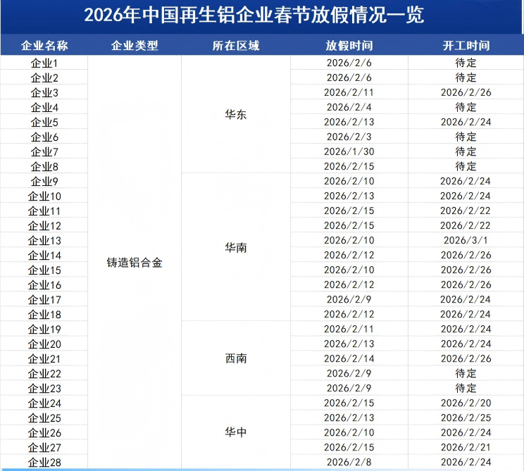 | 报告品种:铝 原文链接:https://mp.weixin.qq.com/s/Nskqq71XqYdH19Zw5rCrLA?scene=1&click_id=1 据富宝资讯调研,2026年中国再生铸造铝合金企业春节放假时间多数集中于2月13-15日之间,其中部分地区企业受政策以及设备检修等影响,存在提前1周放假情况,尤其在2026年初铝市极端行情的影响下,成本及利润波动率大幅增加,生产风险随之激增;此外节前市场需求端同比往年表现不佳,一方面铸造铝合金期货上市后期现商入场市场现货报价逐步呈现三方差异化现象(厂家-贸易商-期现商),且节前基差的扩大导致期现报价远低铝企对外售价,企业常规贸易单遭到较大压制;另一方面在现货价格波动过大背景下,2026年下游企业放假周期提前,致使铝企订单同比下滑。开工时间上,多数铝企集中在正月初八到初十之间烘炉,部分直供铝液占比较大的企业多在初五左右提前复工复产。