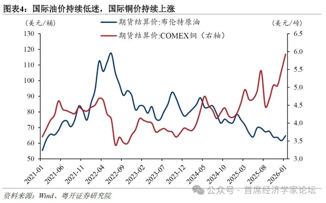 二、春节错月导致1月CPI同比回落,有色金属价格上涨推动PPI同比持续回升 2026年1月CPI同比上涨0.2%,较上月回落0.6个百分点,主要受春节错月因素拖累。2025年春节在1月29日,节前涨价效应显著推高1月物价;而2026年春节在2月17日,节前物价上涨集中在2月上半月。春节错月将导致2026年1月CPI同比暂时性回落,2月同比再度回升,因此建议将1月和2月物价指数合并分析,会更为准确。具体来看,1月食品价格同比下降0.7%,影响CPI同比下降约0.11个百分点,其中,猪肉和鸡蛋价格同比分别下降13.7%和10.6%。服务中,飞机票、旅行社收费和家政服务价格同比分别下降14.3%、7.7%和3.5%,合计影响CPI同比下降约0.16个百分点。 2026年1月PPI同比为-1.4%,较上月回升0.5个百分点,主要受益于人工智能等新兴产业投资热潮导致的国际有色金属价格上涨。人工智能等数字化技术快速发展,对电力的巨大需求导致铜等有色金属短缺,国际有色金属价格大幅上涨。1月有色金属矿采选业和有色金属冶炼和压延加工业价格同比分别上涨22.7%和17.1%。“反内卷”成效持续显现,部分行业供需结构有所改善,非金属矿物制品业、黑色金属冶炼和压延加工业、计算机通信和其他电子设备制造业价格同比分别下降5.4%、3.7%和1.6%,降幅分别比上月收窄1.4、1.0和0.6个百分点。 此外,国际油价低迷对CPI和PPI同比均形成明显拖累。1月份能源价格同比下降5.0%,影响CPI同比下降约0.34个百分点,其中汽油价格同比下降11.4%,降幅比上月扩大3.0个百分点。PPI方面,石油和天然气开采业、石油煤炭及其他燃料加工业、煤炭开采和洗选业、电力热力生产和供应业价格同比分别下降16.7%、11.5%、9.8%和2.3%。