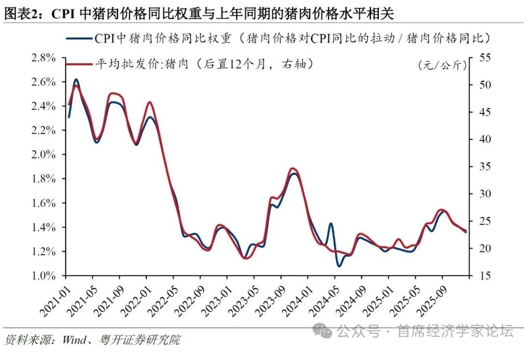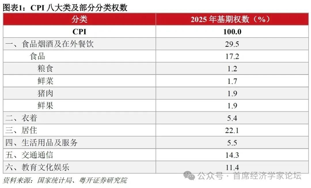 | 2026年2月11日,国家统计局公布1月CPI和PPI数据,并对价格指数进行五年一次的基期轮换。国家统计局首次公布了CPI基期轮换后各主要分项的权重,体现出数据公布透明度的进一步提升。 基期轮换和分项权重具体是什么?与居民的物价感受有何关系?1月CPI和PPI表现如何?后续如何进一步推动物价合理回升? 一、如何理解CPI基期轮换、分项权重与居民物价感受? CPI同比是不同商品和服务价格同比的加权平均值,因此CPI同比的变化既取决于各类商品和服务价格的波动情况,也受各分项权重变动的影响。居民有时觉得CPI数据与自身感受不一致,很大程度上是因为居民个体对不同商品和服务价格的主观权重,与CPI各分项的实际权重存在偏差。例如,居民对高频消费的蔬菜、肉类、水果等价格变化的感知度较强,主观权重较高,而对汽车、家电等低频消费品的价格变化不太敏感,主观权重较低;而CPI则是根据全社会的居民消费结构来设置权重,食品的实际权重低于居民的主观权重,耐用消费品的实际权重高于居民的主观权重。因此,当天气因素导致蔬菜价格大幅上涨时,居民对物价上涨的感受比较明显,但可能同期汽车、家电等商品降价促销,对冲之下,CPI同比可能变化不大,从而与居民感受不一致。 CPI各分项的权重,存在“五年一大调,一月一小调”的特征。 首先,“五年一大调”是因为国家统计局每五年要对CPI进行一次基期轮换,即对一篮子代表性消费品和服务的类别、数量等进行调整,以反映居民消费结构的最新变动。国家统计局自2026年1月开始编制和发布以2025年为基期的CPI。 类别方面,将“食品烟酒”这一类别名称修改为“食品烟酒及在外餐饮”,“旅游”这一类别名称修改为“旅行社及其他旅游服务”;新增了住房安防设备、老年用品、洗碗机、车用电力、摄影服务、互联网医疗服务、医疗美容服务等反映消费新内容的商品和服务分类,进一步扩大新经济新领域覆盖面。 权重方面,食品烟酒及在外餐饮、衣着、居住、生活用品及服务、交通通信、教育文化娱乐、医疗保健、其他用品及服务八个大类的2025年基期权数分别为29.5%、5.4%、22.1%、5.5%、14.3%、11.4%、8.9%和2.9%。与2020年基期相比,CPI中服务权数有所上升,消费品权数有所下降;食品烟酒及在外餐饮、交通通信、教育文化娱乐、医疗保健、其他用品及服务五个大类权数有所上升,衣着、居住、生活用品及服务三个大类权数有所下降;食品烟酒及在外餐饮大类中,食品权数有所下降,在外餐饮权数有所上升。权重调整会对CPI同比数据造成扰动,经测算,本次基期轮换对CPI各月同比指数的影响平均约为0.06个百分点。 其次,“一月一小调”是因为各月的CPI同比或环比权重受到商品或服务价格的影响。CPI各分项的权重等于购买固定篮子中各类商品或服务的支出占购买整个篮子所需支出的比重。在基期轮换后的五年内,固定篮子中各分项的数量是固定的,但价格是时刻变化的,因此五年内各月的权重将取决于各分项的价格水平。具体来看,CPI同比权重受去年同期价格水平影响,环比权重受上月价格水平影响,同比权重滞后环比权重11个月。例如,2021—2025年,CPI中猪肉的同比权重与滞后12期的猪肉价格水平相一致。