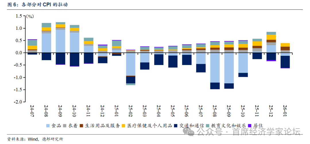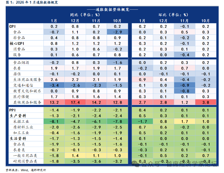 | 2026年1月国内通胀受春节错位影响暂时回调:2026年1月居民消费价格指数(CPI)同比上涨0.2%,涨幅较上月回落0.6个百分点(前值为+0.8%),环比上涨0.2%,与前值持平。扣除食品和能源的核心CPI同比上涨0.8%,较上月回落0.4个百分点(前值为+1.2%),环比上涨0.3%,创近6个月新高,显示内需修复韧性犹存。与此同时,工业生产者出厂价格指数(PPI)同比下降1.4%,降幅较上月收窄0.5个百分点(前值为-1.9%),环比上涨0.4%,涨幅比上月扩大0.2个百分点(前值为+0.2%)。总体来看,春节错月导致CPI涨幅阶段性走低,但工业品价格延续筑底回升态势,通胀水平仍处于温和区间。 食品和服务价格同比转弱是CPI回落主因。1月食品价格同比由上月上涨1.1%转为下降0.7%,对CPI同比的拉动由上月上拉约0.21个百分点转为下拉约0.11个百分点。这一转变主要因为去年同期基数偏高:2025年1月恰逢春节,食品和餐饮价格当时有所上涨,而今年1月缺乏春节需求高峰,食品项价格同比普遍走弱。其中,鲜菜价格同比上涨6.9%,涨幅较上月回落11.3个百分点,上拉CPI的作用比上月减少约0.27个百分点;鲜果价格同比涨幅回落至3.2%(较上月回落1.2个百分点)。猪肉和鸡蛋价格同比则分别下降13.7%和10.6%,降幅仍处两位数。其中,猪肉价格下跌拖累CPI约0.28个百分点,依然是食品项最大的下拉因素。服务价格同比上涨仅0.1%,比上月0.6%的涨幅明显回落,对CPI的拉动缩减至约0.05个百分点。 受春节假期延后导致出行高峰错后影响,交通出行相关服务价格同比走低:飞机票价格同比下降14.3%,旅行社收费下降7.7%,家政服务价格下降3.5%,三项合计拉低CPI同比约0.16个百分点,而上月这三项合计对CPI还有小幅正贡献。由于去年同期春节早至1月,居民节前出行和消费旺盛,造成今年1月上述服务价格同比基数抬高,出现明显回落。与此同时,国际油价下行通过成品油价格传导使能源商品价格降幅扩大,1月能源价格同比下降5.0%,较上月多下拉CPI约0.06个百分点;其中汽油价格同比下降11.4%,降幅比上月扩大3个百分点。能源和出行项价格走弱进一步加深了CPI的回落幅度。 核心通胀韧性犹存。 剔除食品和能源,1月核心CPI同比上涨0.8%。虽然较上月略有回落(前值为+1.2%),但主要消费品和服务价格继续稳步上涨,显示内需复苏的惯性仍在。耐用品和一般消费品价格在政策推动下保持强势:1月家用器具价格同比上涨6.6%;同时,国际金价上涨传导至国内,黄金饰品价格同比飙升77.4%,继续领涨非食品消费品。服装类和鞋类价格同比分别上涨2.1%和1.4%,前值分别为1.8%和1.4%,反映居民日常消费需求平稳增长。总体来看,核心通胀的上涨态势尚未逆转,物价底部抬升的趋势依然延续。 PPI同比降幅收窄,“反内卷”政策下行业价差修复。2026年1月PPI同比下降1.4%,降幅较上月收窄0.5个百分点。在国内需求回暖和供给侧优化背景下,工业品出厂价稳步修复,结构亮点增多: 一方面,受益于供给侧治理和“反内卷”相关政策的持续推进,部分此前价格竞争激烈的行业呈现企稳回升态势,出厂价持续修复。新能源产业链相关行业价格延续上行势头,锂离子电池制造价格已连续4个月环比上涨,光伏设备及元器件制造价格本月环比转正上涨1.9%。电气机械和器材制造业出厂价格同比由负转正,上涨0.8%。 另一方面,受国内统一大市场建设和需求改善拉动,上游原材料行业价格企稳回升。1月生产资料价格同比下降1.3%,好于上月的-2.1%。其中,有色金属相关行业涨幅突出:国际金属行情上行叠加国内新能源和装备需求旺盛,有色金属矿采选业出厂价格同比大涨22.7%,有色冶炼和压延加工业上涨17.1%。与此同时,文教工美体育娱乐用品制造业价格同比上涨21.2%,显示部分轻工制造领域(如工艺礼品、文化用品等)在春节前备货需求增加下售价走高。此外,电炉钢产能出清和基建需求预期带动下,黑色金属冶炼和压延加工业价格同比降幅收窄至3.7%(前值为-4.7%),水泥等非金属矿物制品业价格同比降幅收窄至5.4%(前值为-6.8%)。这些变化表明,在产能治理和规范竞争秩序的政策引导下,工业品价格中枢较前期低点有所上移,各行业“价格内卷”现象有所缓解。 下游生活资料和能源行业通缩压力仍存。石化、化工等中游领域虽然供给偏宽松,但跌势趋缓:基础化工原料制造价格环比由下降0.1%转为上涨0.7%。受国际油价此前回落影响,能源行业承压显著。其中,石油和天然气开采业出厂价同比仍下降16.7%,石油煤炭及其他燃料加工业下降11.5%,煤炭开采和洗选业下降9.8%。另外,下游生活资料价格同比下降1.7%,较上月的-1.3%略有加深,主要受春节错位导致部分消费品去年同期价格偏高的影响。但生活资料内部结构分化:食品类出厂价同比下降1.9%(前值为-1.5%),纺织衣着类下降0.7%(前值为-0.1%),一般日用品和耐用消费品价格同比均下降1.8%(前值分别为+1.4%和-3.5%)。总体而言,生活资料价格对PPI的拖累短期仍在,但更多由基数与季节因素驱动,后续仍需观察春节后需求修复与企业定价行为的边际变化。 展望未来几个月,受春节时点错位影响,2月CPI同比或将有所反弹。一方面,2026年春节在2月中旬,节日期间食品和服务需求集中释放,预计将带动当月物价环比或将有所上升;同时,由于去年2月并非春节月,同比对比基数相对较低,今年2月CPI同比读数可能出现跳升。但剔除节日短期扰动,国内物价仍将保持温和运行态势。PPI方面,工业品出厂价有望延续修复轨迹。