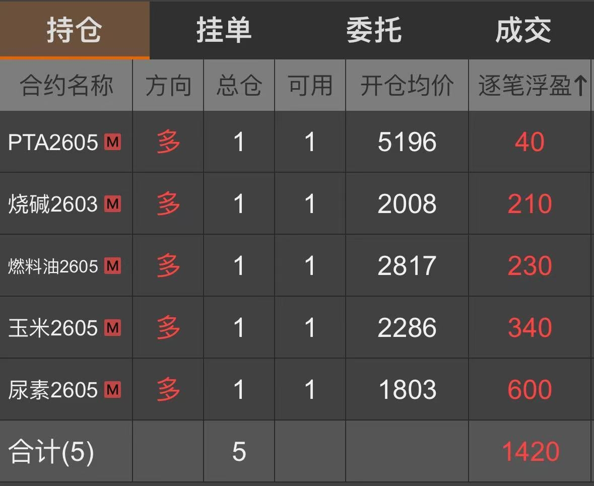 | 一、开仓总结 沥青:2025年12月17日,达到启动点的开仓条件,所以在14:52开多一手沥青2602合约,开仓价为2995。沥青2602合约于2026年1月6日21:17移仓至主力合约2603,开仓价为3159。 纯苯:2026年1月7日,达到启动点的开仓条件,所以在14:54开多一手纯苯2603合约,开仓价为5459。 燃料油:2026年1月9日,达到启动点的开仓条件,所以在14:56开多一手燃料油2603合约,开仓价为2514。燃料油2603合约于2026年2月5日21:35移仓至主力合约2605,开仓价为2817。 PTA:2026年2月10日,达到启动点的开仓条件,所以在14:53开多一手PTA2605合约,开仓价为5230。 玉米:2026年2月10日,达到启动点的开仓条件,所以在14:53开多一手玉米2605合约,开仓价为2286。 对二甲苯:2026年2月11日,达到启动点的开仓条件,所以在14:40开多一手对二甲苯2605合约,开仓价为7390。 尿素:2026年2月11日,达到启动点的开仓条件,所以在14:42开多一手尿素2605合约,开仓价为1803。 瓶片:2026年2月11日,达到启动点的开仓条件,所以在14:43开多一手瓶片2605合约,开仓价为6228。 烧碱:2026年2月13日,达到启动点的开仓条件,所以在14:51开多一手烧碱2603合约,开仓价为2008。