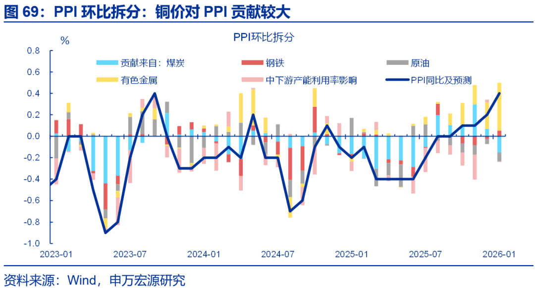 (四)1月通胀分化,背后源于春节错位、输入性因素拉动提升,需求偏弱共同影响 要闻:2月11日,国家统计局公布1月通胀数据,CPI同比0.2%、前值0.8%、预期0.4%、环比0.2%;PPI同比-1.4%、前值-1.9%、预期-1.5%、环比0.4%。 总结: 1月PPI降幅明显收窄,主因铜价对PPI的拉动进一步增加,基期轮换也有一定程度的影响。1月PPI环比0.4%,同比上行0.5pct至-1.4%。我国价格指数每五年进行一次基期轮换,2026年开始为新一轮基期轮换调整,测算本次基期轮换对每月PPI同比的影响平均约为0.08个百分点,总体较小。更重要的是,1月铜价涨幅进一步扩大(环比9.3%),相应有色采选、有色压延业价格环比分别5.7%、5.2%,拉动PPI环比0.5%,为最强贡献项。钢价对PPI贡献也为正,拉动PPI环比0.1%。