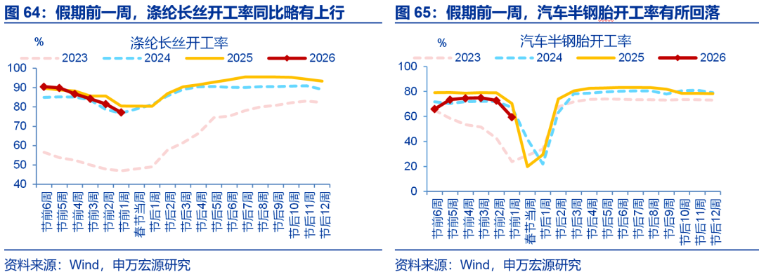 (三)工业生产整体向好,建筑业开工表现分化 要闻:截至春节假期前1周(2月9日至2月15日),工业生产方面,冶金链、石化链开工均有回升。建筑业开工表现分化,反映地产投资的粉磨开工率有所回落,而反映基建投资的沥青开工率则维持韧性。 总结: 春节假期前,工业生产整体向好,建筑业开工表现分化。春节假期前1周(2月9日至2月15日),工业生产中,高炉开工延续上行(环比0.6%),同比维持在2.2%。石化链开工也有改善,纯碱、涤纶长丝开工同比分别较前周回升1.5、0.9个百分点至-2.2%、-3.3%。相比之下,汽车半钢胎开工率表现较弱,同比回落4.8个百分点至-10.9%。建筑业开工方面,更多反映地产投资的全国粉磨开工率有所走弱,同比回落4.2个百分点至-0.1%;沥青开工率维持韧性,同比维持在1.1%。