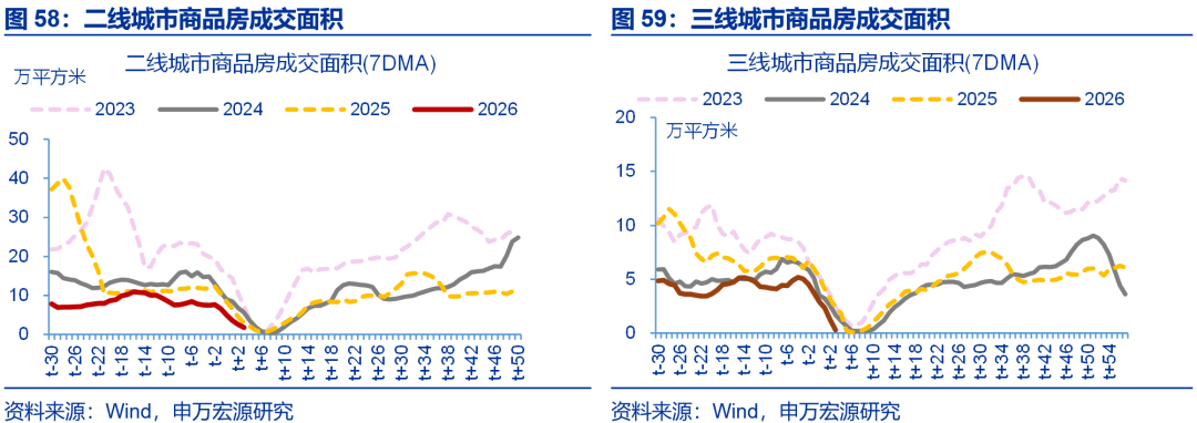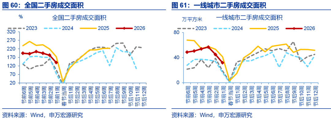 (二)地产成交低迷,结构上一线成交降幅较大 要闻:春节假期第1-6日(2月15日至2月20日),30大中城市商品房成交面积合计10.2万平方米,日均成交面积同比-43%。 总结: 春节假期,全国新房、二手房成交偏弱,结构上一线成交回落幅度较大。假期第1-6日(2月15日至2月20日),30大中城市商品房成交面积合计10.2万平方米,同比-43%、较假期前1周回落10.6个百分点。结构上一线城市商品房成交面积回落幅度较大,同比较假期前1周下行14.7个百分点至-46.8%,二线、三线商品房成交面积回落幅度相对较小,同比分别较假期前1周下行7.4、12.5个百分点至-40%、-45.2%。全国二手房成交面积也有回落,假期前1周同比较假期前2周下行3.6个百分点至-20%;其中一线城市二手房成交面积同比回落7.6个百分点至-22.8%。