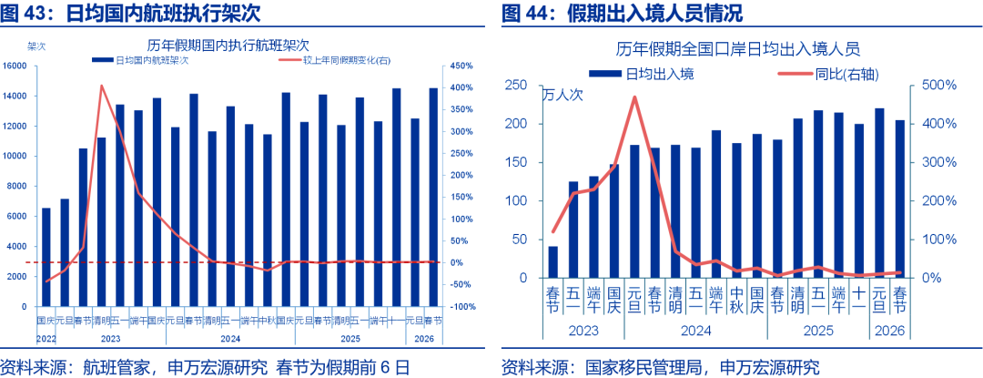 三、国内数据&事件:春节假期出行强度持续上行,传统游、特色游均有升温 春节假期,人流出行持续上行;结构上,传统游、特色游热度均有回升。相比之下,电影消费有所走弱,观影人次、平均票价均有回落。 (一)春节假期出行强度持续上行,传统游、特色游均有升温 要闻:2026年春节假期第1-6日,全社会累计跨区域人员流动量17.2亿人次,日均人流量同比4.6%,较春运返乡期间上行0.9个百分点。 总结: 特征一:2026年春运返乡期间,人流出行节奏偏晚、集中于除夕前3日。2026年春运开启后,全社会跨区流动量同比维持在1.5%附近;而除夕前三天(腊月二十六至腊月二十八)人流强度明显上行、达到阶段性高峰(同比6%),显示返乡客流更加集中。具体交通方式看,反映远距离出行的公共交通日均旅客发送量(含营业性公路、铁路、水路、航空)同比5.2%;不同于往年铁路旅客发送强度较高,2026年春运返乡期间公路、民航旅客发送强度较高,同比分别为6.1%、4.4%,铁路旅客发送量同比仅2.7%。此外,自驾出行强度相对较低,日均人流量同比仅3.3%。