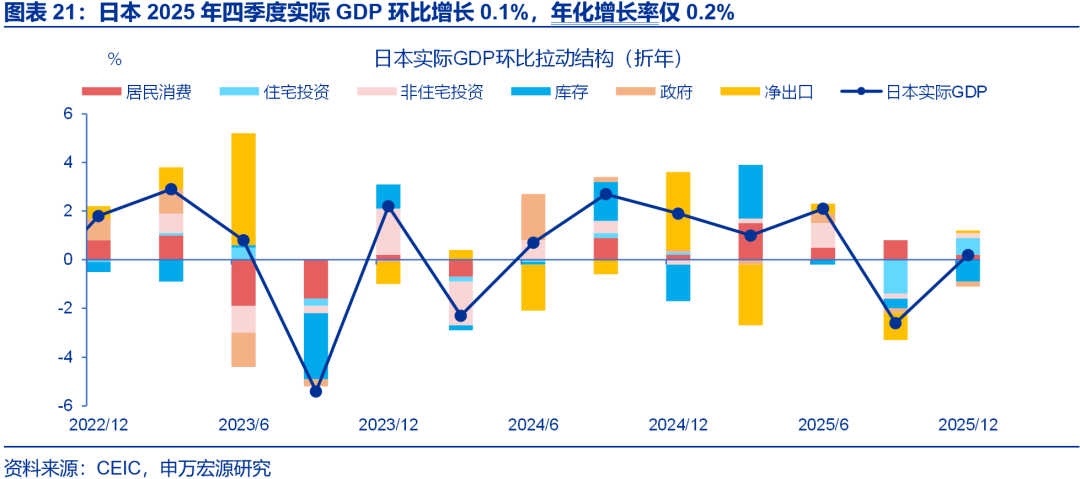 (四)日本GDP:四季度日本经济增长弱于市场预期 四季度日本经济增长弱于市场预期。日本2025年四季度实际GDP环比增长0.1%,年化增长率仅0.2%,低于市场预期(0.4% QoQ / 1.6% 年化)。结构上,四季度日本住宅投资环比改善,居民消费小幅走弱。关注日本2026年“春斗”结果。