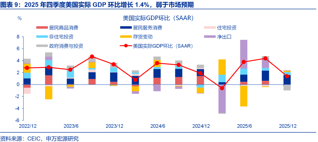 四季度AI投资表现稳健,库存下降幅度收窄,住宅投资边际改善。四季度,美国私人投资对实际GDP增速(环比年化)的拉动达到0.66个百分点,三季度为0.03个百分点,主要拉动力来自于库存变动,其次为住宅投资。1)住宅投资方面,随着美联储降息、特朗普政策改善住房可负担性,2026年美国房地产市场或处于“温和”复苏阶段;2)非住宅投资方面,结构上知识产权投资拉动提升,设备投资有所放缓,后者受交运设备拖累,可能与汽车消费疲软、关税不确定性有关。换句话说,四季度AI相关投资仍然对经济增长形成支撑;3)库存方面,四季度美国私人库存变动拉动经济增速0.21个百分点,较三季度提升0.33个百分点,对应美国私人库存下降幅度收窄。随着2025年前期囤积的库存消耗,美国库存周期有望转向补库。