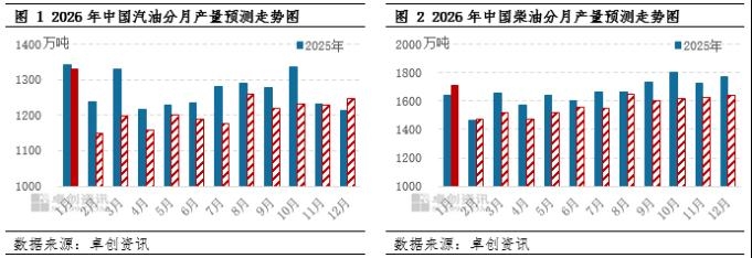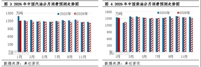 新能源替代持续冲击,成品油消费量或继续降低 2026年,国民经济和社会发展进入“十五五”发展周期,将以扩大内需作为战略基点,持续提振消费,实施更加积极的财政政策和货币政策。未来中国经济增长动能可能加快,中国经济继续稳中回升迈向高质量发展阶段,宏观政策对成品油消费带来一定的提振作用。但是受到新能源替代资源的冲击,年度汽、柴油消费量仍处于持续下滑的态势,但是同比下滑速度有所放缓。 汽油方面,新能源汽车市场渗透率持续提升,国内新能源新车销量占汽车销量的比重已经达到54.7%以上水平,但是2026-2027年新能源汽车购置税补贴迎来新变化,消费者购置列入《减免车辆购置税的新能源汽车车型目录》的车型可享受购置税减半征收的政策,消费者购车成本将有增加,或将一定程度上抑制新能源汽车的销售增速。卓创资讯预计2026年中国汽车保有量有望达到3.85亿辆左右,同比涨幅在4.61%。当前国内传统燃油汽车销量比重在国内汽车销量中占比持续下滑,未来这一趋势或延续。 柴油方面,在稳增长、稳政策、稳预期的支撑下,中国经济或向好回升。投资出口驱动转变内需消费主导,强预期下国内经济对柴油消费起到一定提振作用,未来基建相关投资速度预期提升,带动资金向实物工作量转化提速,对柴油消费恢复提供动力。但当前房地产投资持续偏弱运行,建筑业商务活动指数表现低迷,交通物流运输智能化、绿色物流不断发展的背景下,物流运输转型一定程度上将抑制柴油消费需求,部分下游行业对柴油需求支撑不足。叠加LNG重卡和新能源重卡对柴油运输消费替代作用也逐步增强,综合分析下,未来柴油消费量同比小幅下降或成为常态。 综合考虑下,预计2026年中国汽、柴油消费量或同比继续下滑,但汽油消费量降幅或同比收窄。预计2026年汽油消费量或在1.4亿吨左右,同比下降4.13%;柴油消费量或在1.82亿吨左右,同比下降1.63%。分月来看,春节、国庆长假和暑假自驾出行范围扩大,对汽油消费带来支撑;柴油方面,天气和气温对户外施工影响较大,物流仓储邮政用油主要受电商促销节影响,因此3-5月以及10-11月柴油消费量普遍回升,但是整体回升空间逐步收窄。