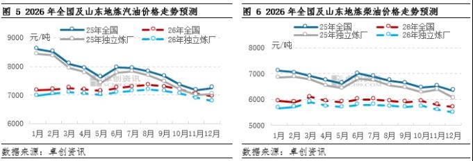 驱动因素整体偏向利空,成品油行情或偏弱运行 2026年中国汽、柴油供需双弱局面预期延续,基本面的驱动因素对国内成品油市场整体利空,将从根本上对市场价格形成抑制。而从原油方面分析,卓创资讯预计在宏观风险整体可控、不发生地缘冲突超预期升温危机事件的情况下,国际油价中枢在2026年或继续下移。预计国际原油价格或在年中触及年内最低点,6-7月回升后震荡运行,四季度仍有偏弱预期,全年价格中枢较2025年下移,对国内成品油价格走势偏向利空。 综合研判,预计2026年国内成品油价格或呈现先跌后涨再跌的阶段性走势,均值同比下滑。预计年内全国及山东地炼92#汽油批发均价或分别在6950-7350、6800-7200元/吨;全国及山东地炼0#柴油批发均价或分别在5700-6100、5500-5900元/吨波动。 其中92#汽油批发价格高位或出现在8月,主要原因在于期间原油有望维持偏强走势,叠加国内暑假开启,居民驾车出行范围将扩大,出行频次有望提升,同时高温天气下,汽车空调用油有所增加,汽油需求或存在阶段性转好为汽油批发价格上行提供一定助力,汽油批发价格有望达到年内高位。0#柴油批发价格高位或出现在3月,主要原因在于,国内温度逐渐上升,户外工程开工负荷逐渐提升以及电商购物节陆续开启,叠加原油价格重心有望较前期上移,多重利好因素叠加助力柴油批发价格回涨。汽油及柴油批发均价低位或出现在12月份,主要原因在于,原油价格有望在该月份将至年内偏低水平,炼厂生产成本有望降低,同时,国内温度较低,且无大型假期,汽柴油需求呈现偏弱态势,预计汽柴油批发价格或较前期继续回落,汽柴油批发价格或刷新年内低值。