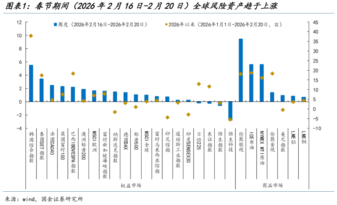 | 1、全球资产:再平衡仍在继续 我们在春节前的周报《高切低与简单题》指出:本轮市场的高切低是建立在内外协同复苏的基础之上;与此同时,AI交易也将逐渐步入第二阶段,即市场预期真正开始向技术本身回归,重新评估AI的发展对各行业的真正影响,普涨行情结束,在高波动中进一步分化可能是未来一段时间的常态。从春节期间(2026/2/16-2026/2/20)全球市场表现来看,在地缘风险上升、降息预期回升以及美国最高法院驳回IEEPA关税等多重因素交织影响下,全球风险资产整体趋于上涨,但市场内部表现分化:(1)全球权益风格延续再平衡:以工业、金融、能源为代表的板块继续获得市场青睐。值得一提的是,在工业金属高位震荡消化交易拥挤时,巴西为代表的资源国股市开始高歌猛进;(2)科技资产内部的分化:此前遭遇抛售的软件股股价下行斜率虽有所放缓,但尚且缺乏向上的动力;本周五(2026年2月20日,下同),随着AI代码扫描工具推出,以网络安全为代表的软件股再度承压。而以存储为代表的真正面临供需紧缺的科技细分行业则已出现强劲反弹。市场的焦点不再是AI是否是泡沫,而是当AI从主题走向宏观因素后,积极寻找产业影响和真正主要矛盾与紧缺环节。