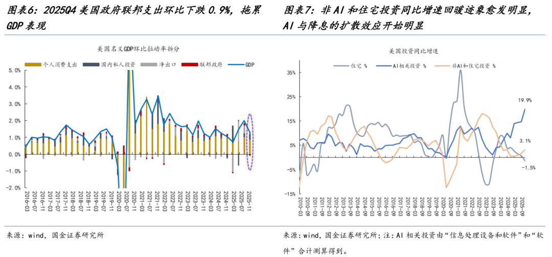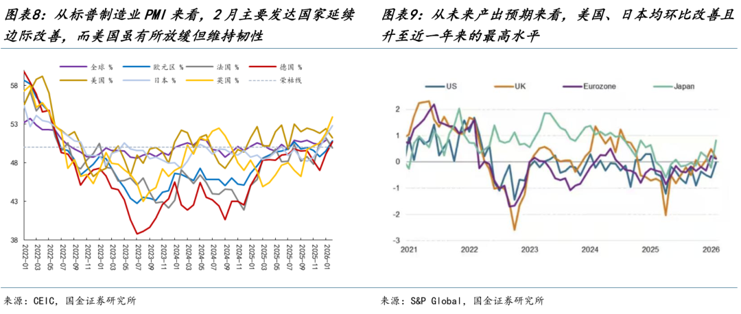 2、制造业周期的进一步抬头 本周美国披露2025Q4的GDP数据,尽管整体增速低于市场预期,但实际上更多来自政府支出的拖累(或与2025Q4政府关门导致的支出扰动有关)。结构上看,投资与消费保持韧性,尤其是以AI投资为代表的细分领域继续表现亮眼。但更值得关注的是,在剔除AI相关投资与住宅投资后,“非AI与住宅”投资增速已显现底部抬升的端倪,投资活动的修复正在从过去相对单一的AI驱动向更广谱的实体部门扩散,这可能是降息周期下,AI从产业投资变成宏观变量的共同作用。事实上,从领先指标标普制造业PMI来看,2月欧洲制造业PMI全面超预期,以德国为代表的制造业国家回升至荣枯线之上,并创下2022年7月以来新高;美国制造业PMI继续稳守荣枯线之上,两者共同指向全球制造业周期这一路径的复苏信号正在逐步增多。值得一提的是,尽管美国2月制造业PMI略有回落(或受阶段性恶劣天气扰动),但企业对未来商业前景的判断则上升至一年多来最高水平。