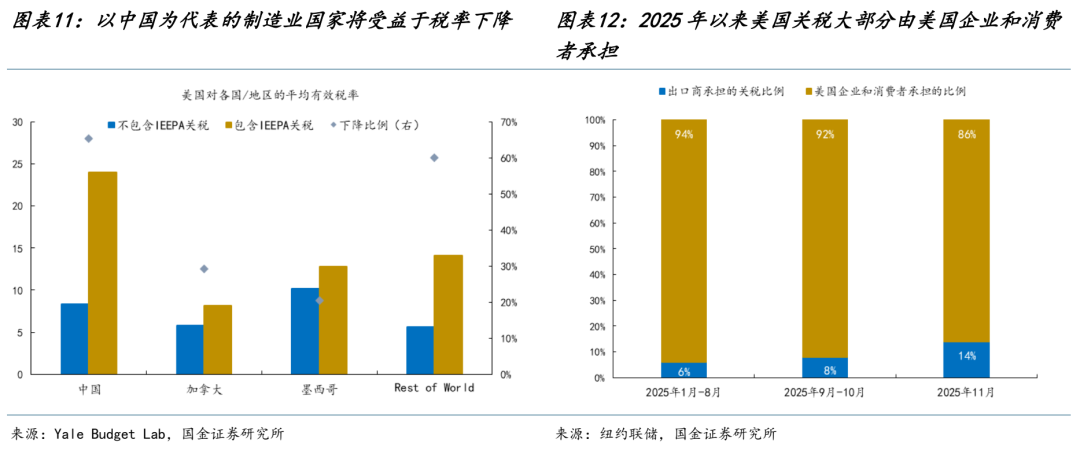 另一方面,本周五美国最高法院对市场密切关注的特朗普依据《国际经济紧急权力法》(IEEPA)征收的关税判定为违法,如果暂且不考虑特朗普通过其他替代性关税工具进行对冲,其结果可能带来:①美国整体有效税率下降;②国家层面,以中国为代表的国家将会面临较为显著的关税水平下降,不考虑替代效应的情况下,相较原先税率水平或将回落约三分之二。从其传导来看:一方面,对美国经济而言,关税对产出端的拖累有望减轻,同时通胀上行风险亦随之缓和,从而使降息路径更为顺畅;另一方面,关税壁垒下降将为企业盈利与居民消费提供一定的缓冲空间,根据纽约联储的测算,当前美国关税负担仍主要由美国企业消费者承担,因此关税税率回落边际上有利于缓解国内成本压力并对全球出口修复形成支撑。当然,特朗普政府仍握有其他替代性工具(如301条款、232条款、122条款以及338条款等),且近期已宣布动用122条款加征关税并启动贸易调查,关税扰动仍会存在,但是其对于资产定价的扰动的上限已经看到。