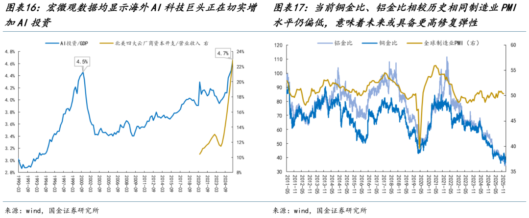 3、大宗商品:从金融过度交易走向产业定价 最近一段时间在多重事件扰动之下以铜为代表的工业金属高位震荡走弱。其本质在于:此前价格的快速上涨已计入较多金融属性溢价,而宏观与产业层面的事件催化则容易通过预期与仓位的再平衡放大价格波动。节前特朗普拟缩减部分钢铁与铝制品关税,叠加近期AI交易遭遇盈利兑现质疑与债务融资担忧升温,共同对工业金属价格形成短期抑制。我们此前提到的资产配置需求驱动并引发投机拥挤的交易短期告一段落,价格信号有望回归真实产业供需,展望未来:一方面,在资源民族主义抬头的背景下,工业金属的地缘溢价持续存在,供给扰动的尾部风险短期难以消散,更高的合意库存仍然是长期趋势;另一方面,需求端来看,科技巨头对AI的现实投入并未出现边际放缓,反而BIG7对2026年的资本开支指引仍显著高于市场预期。与此同时,工业金属也正在迎来新的边际驱动,全球传统周期+新兴市场再投资的上行信号更加明显,有望构成需求端新的支撑。历史经验来看,当前铜金比、铝金比相较历史相同制造业PMI水平仍明显偏低,意味着金属价格或将具备更高的修复弹性。
