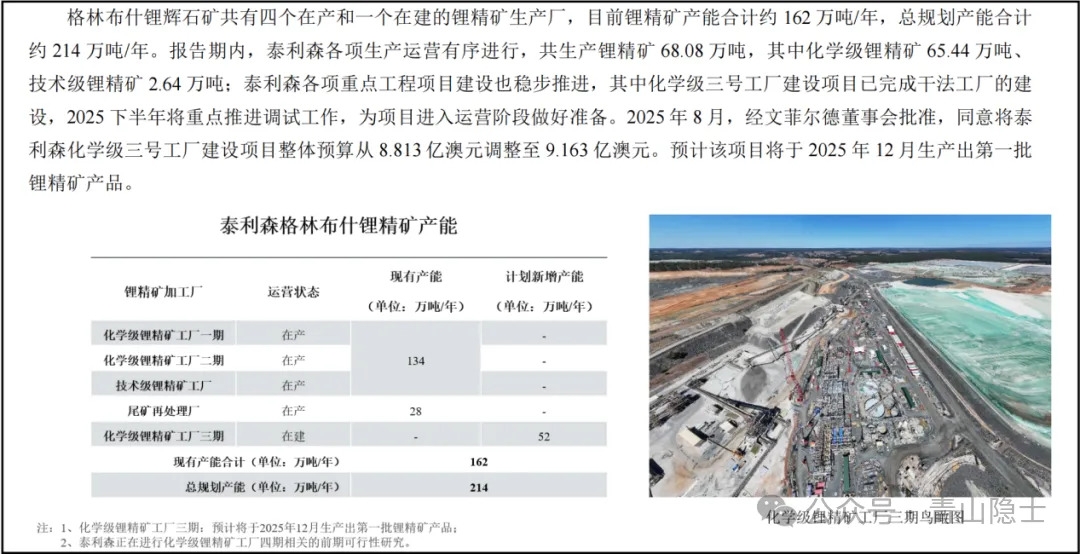 结合天齐锂业2025年中报披露信息,泰利森各项重点工程项目建设持续稳步推进,其中化学级三号工厂已完成干法工厂建设工作,2025年下半年将聚焦调试环节,为项目正式运营筑牢基础。2025年8月,经文菲尔德董事会审议批准,泰利森化学级三号工厂建设项目整体预算由8.813亿澳元上调至9.163亿澳元,项目预计于2025年12月产出首批锂精矿产品。综合来看,泰利森化学级三号锂精矿加工厂大概率将在2025年底前实现投产,项目推进节奏稳健。 若不考虑Cattlin矿、Finniss矿及Bald Hill矿因碳酸锂价格暴涨而复产(合计对应近9万吨LCE产能)的可能性,仅格林布什锂矿单一项目,2026年就能贡献6.5万吨LCE的碳酸锂产能增量。 此外,泰利森已规划于2025年启动化学级四号加工厂建设,该厂设计产能与三号工厂保持一致,为52万吨/年锂精矿(折合6.5万吨LCE碳酸锂),初步预计2027年竣工投产。待四号加工厂顺利落地后,泰利森锂精矿总年产能有望突破260万吨,对应碳酸锂产能将达32.5万吨LCE,产能规模再上新台阶。 三、小结 综上所述,2026年澳大利亚的锂资源供应量的同比增速应该在15%左右,中国五矿期货预估的8.2%增速可能偏低。