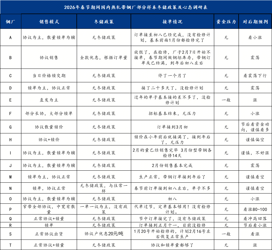 数据来源:Mysteel调研 Mysteel节前调研了解,截止2026年2月10日(小年),国内热轧带钢生产企业样本,依旧仅两家钢厂出台冬储优惠政策,且均为针对内部协议户及周边战略客户制定。其余钢厂均未出台冬储优惠政策,春节期间仍按照往常销售政策执行。华北区域钢厂订单尚可,多接到正月十五前后。部分钢厂看好节后市场,做少量厂内库存。部分钢厂带钢产线3月份存在检修计划,但多数是1月份已经检修完成后面没有检修计划。整体情绪偏谨慎,个别轻度乐观,多没有明确的方向,认为涨跌幅度有限。结合其中的一些代表性的钢厂,总结如下: 钢厂1:节后涨不涨看资金动向了,但是节前盘面走到这个位置了,也释放了一定风险,另外今年过年晚,开年就3月了,我觉得今年需求复苏会快一些,需求强度多大就得观察了,另外国企套保仓位基本上补到了70%左右,没补满,都还等着年后再补一轮,终端库存很低的状态,年后也都是随着订单补货了,年后看市场流动性了。现在所有资源基本集中在套保订单手上,大部分仓位都不太饱和,只是参与的家数多了,年后如果开盘拉涨,这些订单解套解不出来,市场终端还具备一定承接能力,我觉得这是一种走势,可能会先涨后跌,我觉得这种走势概率稍大一些。但是目前套保订单的平均建仓成本应该在100左右,前期套在里边的库存还都有,加上跨周期比较长资金成本,我觉得年后解套的机会也不会太好。 钢厂2:我们从上个月20号就开始检修了,冬储政策没变化,正常协议出货,没有冬储政策,16号左右恢复正常生产。 钢厂3:我们没有政策。基本销售完了。跟往年没啥变化,这段时间过年的单子基本接的差不多了,也没检修计划,今年还好吧,就是放假时间长,再后面的单子也比较难接了。 钢厂4:我们没有冬储政策,代单过节,订单基本够用!没有检修计划,也没资金压力。节后看库存消化情况,感觉消化的好的话能有80-100的涨幅。 钢厂5:春节期间我们没有出政策,跟往年一样,锁单,今年单子不太多,看看后面情况,难道还有人看涨吗?哈哈哈,我们谨慎空。 钢厂6:今年春季我们销售模式没变化,锁单。没出冬储,接了二十多天了,没检修计划,现在资金应该差不多了,没有很大缺口,领导的看法是震荡。最近冷轧订单有好转,有一些原来要放假的,都有不放假的了,节后应该不会一下跌多少,震荡盘整吧,现在市场很难有大的涨跌幅呢。 综上所述,受今年春节时间偏晚、钢厂冬储政策普遍缺位(仅两家钢厂针对核心客户出台优惠)、节前订单多锁定至正月十五前后,且3月份仅个别钢厂存在检修计划(多数已在1月完成检修)的影响,春节期间及节后初期带钢整体供应端韧性较强,主动收缩预期有限;叠加终端库存低位、节后随订单补货的节奏,以及国企套保仓位未补满、市场流动性对价格波动的牵引,预计节后带钢供需格局将呈现“供应偏稳、需求渐进、情绪谨慎”的特征。 但需注意,2-3月板带订单多以低价长单、直供为主,淡季压力逐步显现;短期来看,虽有终端补库需求支撑,但在套保盘解套压力、需求复苏强度不确定的背景下,带钢价格更可能呈现窄幅震荡、先扬后抑的走势,同时上涨周期有限,涨跌空间均受约束,整体以区间博弈为主。 七禾带你去调研,最新调研活动请扫码咨询