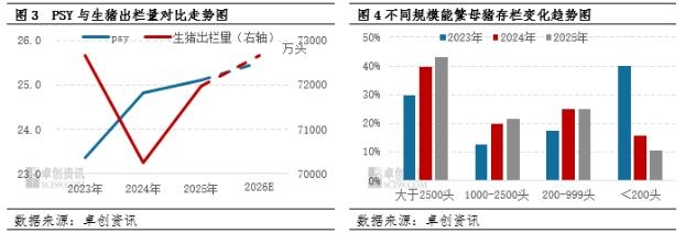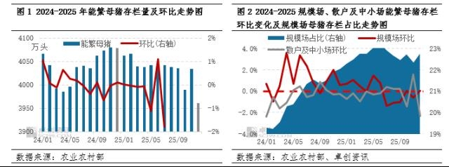 | 【导语】2025年末能繁母猪存栏下滑明显,但减产主体中散户居多推动规模化占比提升,产效提升或对冲母猪减少的影响。2026年产能仍过剩或导致养殖盈利明显缩水,但对中小养殖户来说,也带来大猪供应缺口扩大的契机,未来饲料成本或维持低位,而压栏大猪或减亏增利,成为中小户提供穿越亏损周期的利器。 能繁母猪存栏下滑明显,规模场占比进一步提升 2025年5月以来,农业农村部多次召开会议规划调整生猪产能。6月上旬,举行生猪生产调度会,提出将对全国能繁母猪存栏量在现有基础上调减100万头左右,降至3950万头。政策实施以来,多家头部猪企接到相关部门要求,暂停扩产能繁母猪以及二次育肥。同时在四季度自繁自养和仔猪育肥双双亏损后,也推动自然减产开始,全国能繁母猪存栏量自2025年10月跌破4000万头(3990万头)后,继续下行,至2025年末降至3961万头,为近五年来最低水平。较2024年末的4078万头减少117万头,减幅2.9%,减产计划基本完成。 同时结合卓创资讯对规模养殖企业能繁母猪监测数据分析,规模企业自9月开始进行减产,截至12月,累计减少37.40万头,减幅在4.0%,减产集中发生在9月与11月,10月和12月产能环比持平或微增。而散户及中小场在10月后开始加速减产,母猪累计减少69.32万头。本轮减产过程中,散户母猪减少的绝对数值大于规模场,也推动规模场母猪占比从9月的22.46%上升至12月的22.76%。