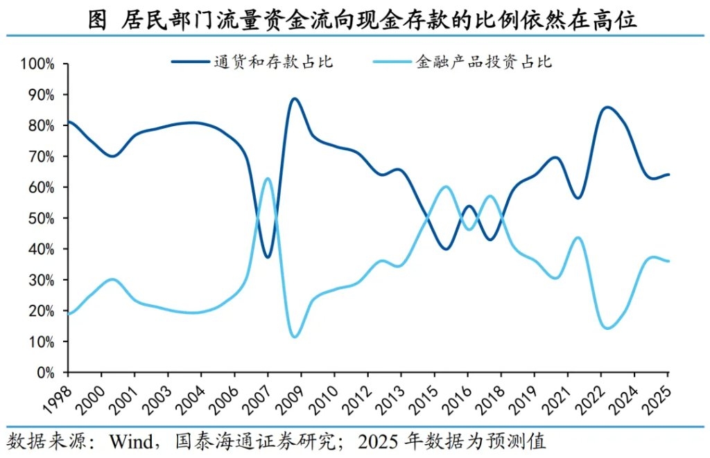 从居民资金流量视角进行交叉验证,也可以得到相对一致的结论。将居民部门新增资金在“通货和存款”与“金融产品投资”之间的配置结构进行对比,可以发现,2025年居民金融资金流向与2024年高度相似,并未出现明显向理财、基金、保险等金融产品端加速倾斜的迹象。这也意味着,即便高息存款逐步到期,居民资产配置仍以防御性和惯性为主,存款体系的稳定性并未明显削弱。