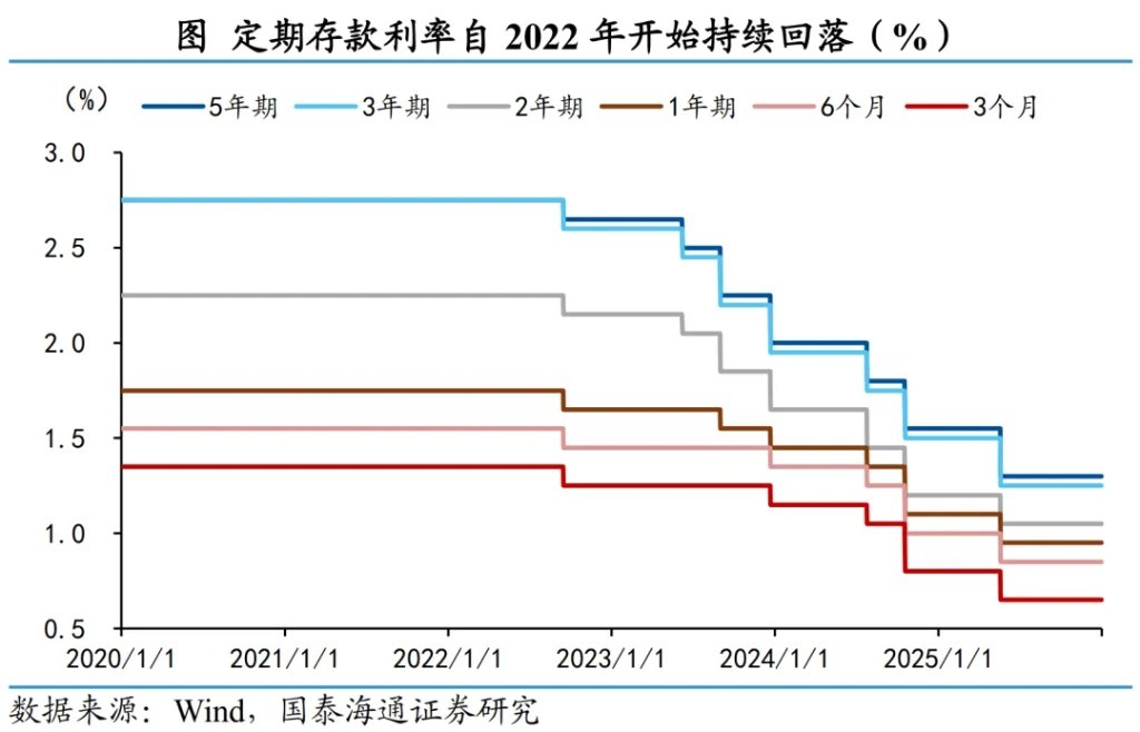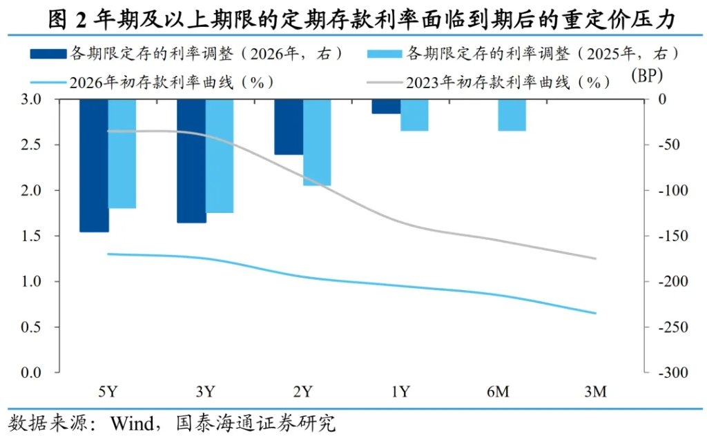 而真正引发市场关注的,并非到期规模本身,而是到期后续作所面临的利率落差。本轮存款利率下行自2022年启动,至2025年5月后阶段性稳定,但不同期限存款在续作时所面临的利率落差并不一致。对于2026年到期的一年期及以内存款,续作时新旧利率差距有限;主要是2年期及以上存款在续作时会集中体现此前的降息幅度。 以国有大银行的标准存款为例,2024年吸收的二年期定存,在2026年续作时利率普遍下降50–60bp;2023年的3年期定期存款,续作利率降幅高达约135bp。此外,银行普遍压缩了长期存款产品,六大行已下架5年期大额存单,部分中小行甚至取消了“整存整取”的5年期产品。 需要指出的是,类似的利率落差在2025年已然出现,2025年到期的2年期和3年期存款续作时同样面临约120bp左右的降幅。2026年的压力更多是边际加重,而非首次出现的激增。