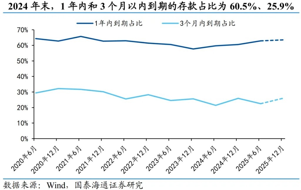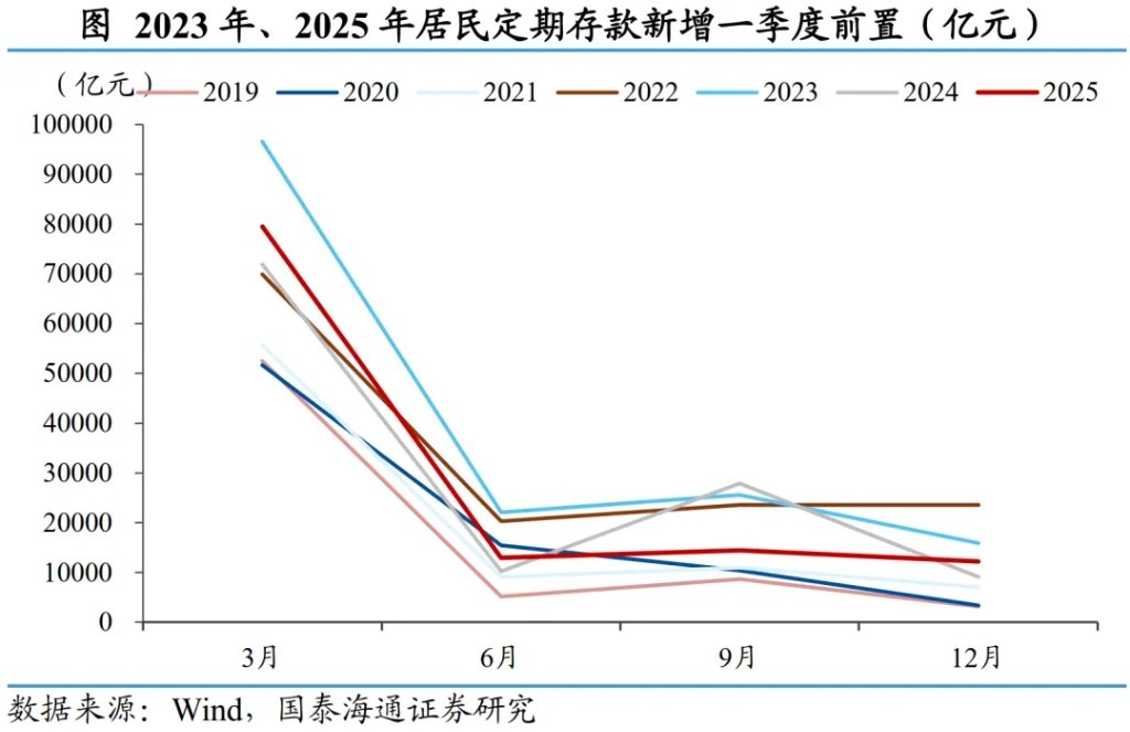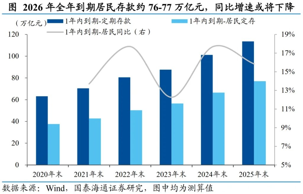 不过,如果将视角转为同比变化,2026年的特殊性可能弱于市场直觉。 类似的,参考2024年样本银行年报测算,2025年全年到期的居民定期存款规模约66.5万亿元,2026年同比增加约9.6-10.8万亿元,对应增速14.5%-16.3%,实际上还低于2025年当年的到期同比增速(约17.7%)。即便聚焦市场最为关注的一季度,2025年一季度居民到期规模约为28.5万亿元,2026年一季度同比增加约4.2–5.9万亿元,虽然增速处于历史偏高区间,但整体仍符合历史运行规律。 本质上,2025–2026年的到期量抬升,只是2022–2023年存款激增的镜像反应。“超额储蓄”在三年后自然转化为“超额到期”,从这一意义上看,2026年更像是一场缓慢上涨的“潮汐”,而非突如其来的“海啸”。