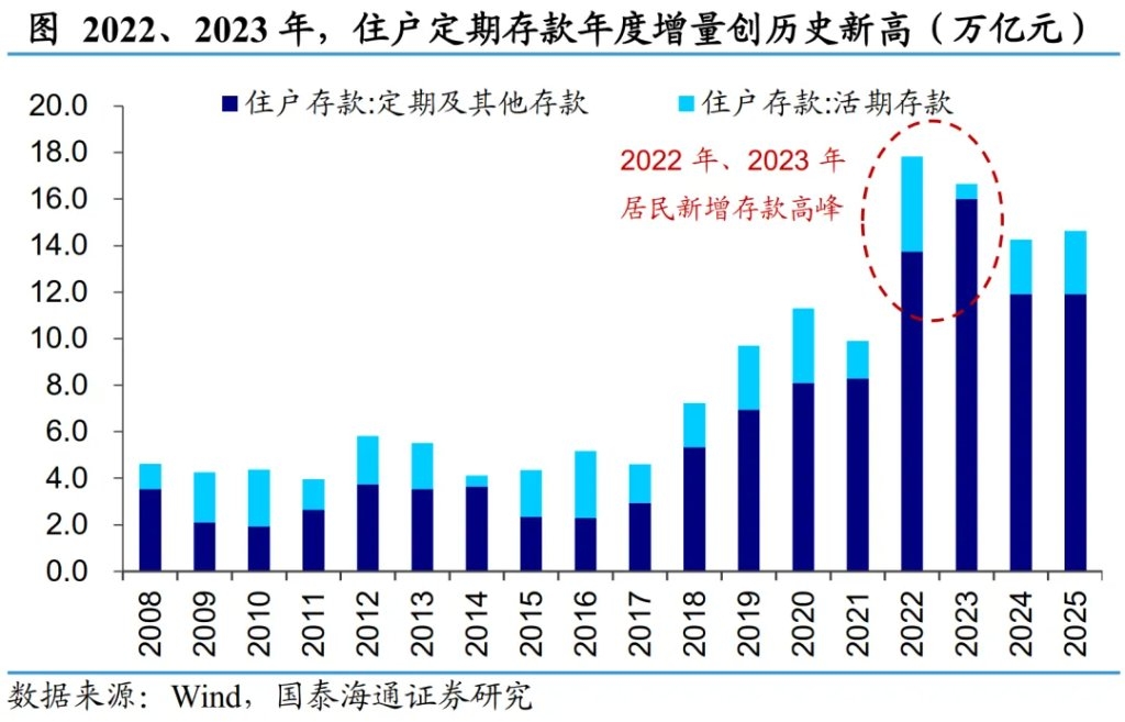 | 为何关注2026年的到期存款? 当前,市场围绕2026年居民定期存款到期、存款搬家等议题的讨论持续升温,多数观点将其视为后续影响市场流动性与资产配置的核心叙事之一。所以在这一时点,为何市场对2026年存款到期问题的关注度显著抬升? 2023年是“超额储蓄”逻辑被火热讨论的一年,作为三年期的终点,2026年成为市场观察存款到期后再配置行为的焦点。一方面,疫情期间居民多挣钱、少花钱确实带来一部分“超额储蓄”;另一方面,随着房地产、基建等底层资产收益的下降、风险的上升,带动居民财富结构阶段性回流存款。2022年、2023年居民存款分别激增17.8万亿元和16.6万亿元,而此前年均仅在10万亿左右。尤其2023年,居民新增定期存款达到16万亿的历史峰值。这批中长期存款的三年期到期节点,强化了市场对2026年居民存款到期再配置的关注。 高息资金到期后的利率下行预期,也提高了市场对存款搬家的关注度。2026年到期资金,是最后一批享受“3字头”利率的长期资金——彼时大行3年期大额存单利率普遍超3%。若这批资金到期后面对1.2%-1.5%的新利率,居民会不会因此“报复性不存钱”?与此同时,理财、基金、保险行业在经历了数年低迷后,也需要一个“资金回流”的宏大叙事来支撑扩容预期,2026年自然成为叙事时间锚点。