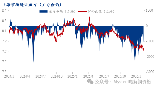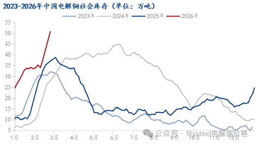 数据来源:Mysteel 三、总结与展望 由于今年春节节假期间,国内部分冶炼厂超预期发货,以及高铜价背景下,下游企业开工表现相对较弱,国内社库累库值相对较多;从供需层面来看,下游企业全面复工复产仍需到元宵节以后,下游消费预计恢复缓慢,同时受春节物流运输延后影响,后续仍有在途货源陆续到货入库计划,因此节后库存本轮累库周期预计延续至3月份中旬附近,国内累库峰值仍有超预期表现,整体或将增至55万吨以上。但值得注意的是,由于进口比价大部分时间同样表现偏弱,以及2026年外贸长单签订受阻,可交割品牌进口铜春节前后清关流入量仍相对较少,境外铜贡献累库幅度有限,同时节后现货仍表现于大贴水局面,进口商清关进口意愿相对较低,后续月内补充预计仍相对不多,叠加部分冶炼厂后续仍有出口计划,一定程度仍将缓解国产货源到货压力,且随着后续下游企业陆续复工复产,下游消费仍存提升空间,因此国内社库经过春节期间集中快速增长阶段,后续增速预计表现放缓。 七禾带你去调研,最新调研活动请扫码咨询