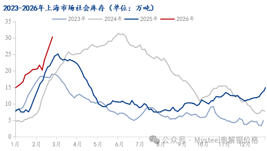 | 报告品种:铜 原文链接:https://mp.weixin.qq.com/s/IRUNclI3T1XyNPmhWzpx0w 前言:每年时逢春节假期后,国内铜社会库存均会在此期间迎来明显的库存积累;据Mysteel节后调研了解,2026年春节后国内社会库存延续明显累库趋势,其中国内社库突破50万吨至50.71万吨,上海市场社库亦突破30万吨至30.40万吨,节后整体国内库存值达近十年来峰值。但值得注意的是,相较于往年,今年节假期间累库量基本为国产品牌货源为主,海外进口到货量相对较少。
