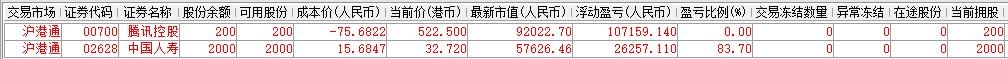 | 账户初始资金:100000.00元 2015年5月18日入金:32000.00元 2015年5月29日入金:9000.00元 2015年6月23日入金:20000.00元 2015年6月26日入金:10000.00元 2015年6月29日入金:20000.00元 2015年7月3日入金:20000.00元 2015年7月8日入金:10000.00元 2016年1月12日入金:90000.00元 2016年1月22日入金:100000.00元 2016年1月27日入金:100000.00元 2016年3月21日出金:270000.00元 2016年4月12日出金:35639.23元 2016年0月10日出金:56913.08元 2016年10月28日入金:60000.00元 2017年3月7日出金:113800.00元 参考市值:169817.16元 账户资产:170220.00元 截至今日账户A股盈亏:-42451.36元 截至今日账户港股盈亏:128348.83元 账户净值:1.905 资金股份