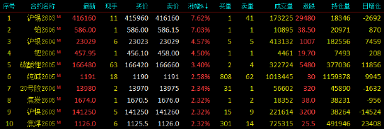 | 2026年2月25日,国内期货主力合约涨跌互现。沪锡、铂涨超7%,沪银、钯涨超4%,碳酸锂涨超3%。跌幅方面,集运指数(欧线)跌超4%,液化石油气(LPG)、低硫燃料油(LU)跌超1%。
