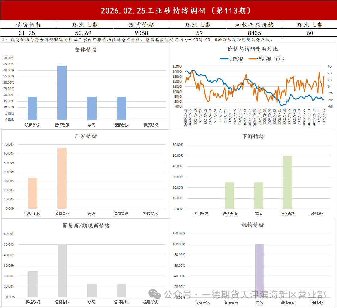 | 报告品种:工业硅 原文链接:https://mp.weixin.qq.com/s/2I7pABrhtcL8MfAtMjPPIA 根据样本统计,本期情绪指数为31.25,较上期大幅上涨50.69,且重回0轴以上,本期样本参与者对未来一周的情绪偏好,且主要是厂家和贸易商环节,下游观点相对仍偏弱。节后来看,期现价格震荡运行,暂无新驱动,基本面也变化不大,后续关注大厂的复产节奏。