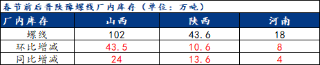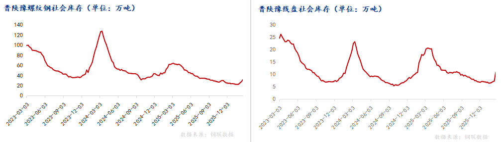 晋陕豫三省份社会库存总计42.6万吨,农历同比减少28.9万吨,社库现阶段低位回升,其中线盘库存上升速率偏高,但整体社库相对低位,市场压力弱于去年。