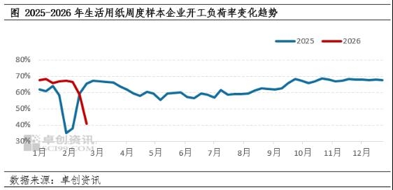 | 【导语】受2025年春节假期影响,生活用纸企业开工负荷呈现显著波动,部分企业因设备维护或经营规划实施停机检修,导致周度样本企业开工负荷率较节前明显下降,但浆纸一体化及深加工配套完善企业维持正常生产,市场供应相对宽松。节后复工节奏差异化明显,预计本周开工负荷率将有所提升,但短期内供需不平衡及成本端利好因素交织,市场交投清淡,纸价以平稳运行为主,中长期走势需关注供需变化及成本波动。 春节假期影响,生活用纸开工负荷率呈现下降 受春节假期因素影响,生活用纸企业开工负荷呈现显著波动。从生产节奏来看,企业排产呈现以下特征:其一,部分企业因设备维护或经营规划实施停机检修,检修周期普遍在7-20天,其中大多数企业集中在12-13日进行检修,少数企业则分别在7-10日和15-20日;其二,部分浆纸一体化企业、深加工配套完善企业以及年度检修计划避开春节的企业维持正常生产状态,市场供应呈现相对宽松态势。 卓创资讯监测数据显示,截至2月19日,生活用纸周度样本企业开工负荷率为40.77%,较春节前一周下降18.06个百分点。值得注意的是,部分企业排产节奏与2025年春节排产略有不同,导致周度样本企业开工负荷率较2025年春节期间略高5.58个百分点。