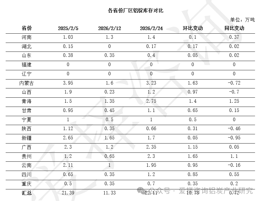 爱择调研过程中发现以下几个特点: 一、由于今年春节前后现货铝价持续运行于相对高位,且市场对未来预期存在分歧,多数电解铝企业选择更为稳健的经营策略。不同于往年部分企业持有“赌行情”心态进行厂区囤货,今年企业更倾向于“现产现发、快进快出”。调研显示,春节期间生产出的铝锭并未大规模转化为厂区库存,而是被迅速发往下游或社会仓库。 二、新疆、山西、内蒙古、陕西等铝锭主产区节后厂区铝锭库存同比录得下降是企业销售策略转变和物流效率提升共同作用的结果。以新疆为例,作为全国最大的电解铝输出地,其铁路专线及公路货运在春节期间维持常态化运行。部分铝厂反馈自农历初四起便恢复铝锭外发,较往年提前2-3天。大量厂区库存向社会库存流转使得主流仓库面临较大的卸装压力,华东部分仓库站台积压集装箱过千,华南部分仓库也已经处于爆仓的状态。 三、青海、贵州等省份节后铝锭库存较往年增加相对明显主要是受发运节奏的影响。近日区域内铝厂也已经陆续开始外发铝锭,部分企业计划近日在网上对铝锭进行公开招标销售,预计未来1-2周内上述区域的厂区库存将出现明显回落。 四、随着下游加工企业陆续复工复产,河南、甘肃、山东、内蒙古等地区的铝水比例已经开始缓慢爬坡。调研显示,今年春节期间行业铝水比例最低降至63.17%左右。随着元宵节后下游开工率进一步提升,预计3月上旬行业铝水比例大概率回升至70%上方。铝水比例的提升意味着铸锭量的相应减少,这将缓解厂区铝锭的后续补给压力。 五、从总量视角看,当前铝锭社会库存约为111万吨,叠加厂区库存22.11万吨,合计显性库存总量约133万吨。考虑到厂区库存后续将陆续向社会仓库转移,且下游消费完全复苏仍需时间,社会库存仍面临一定的入库压力。基于上述判断,爱择咨询维持此前节后铝锭社会库存峰值在140万吨附近的预期不变。 七禾带你去调研,最新调研活动请扫码咨询