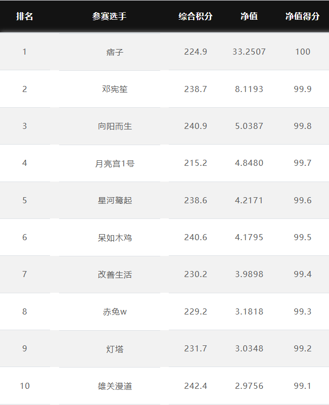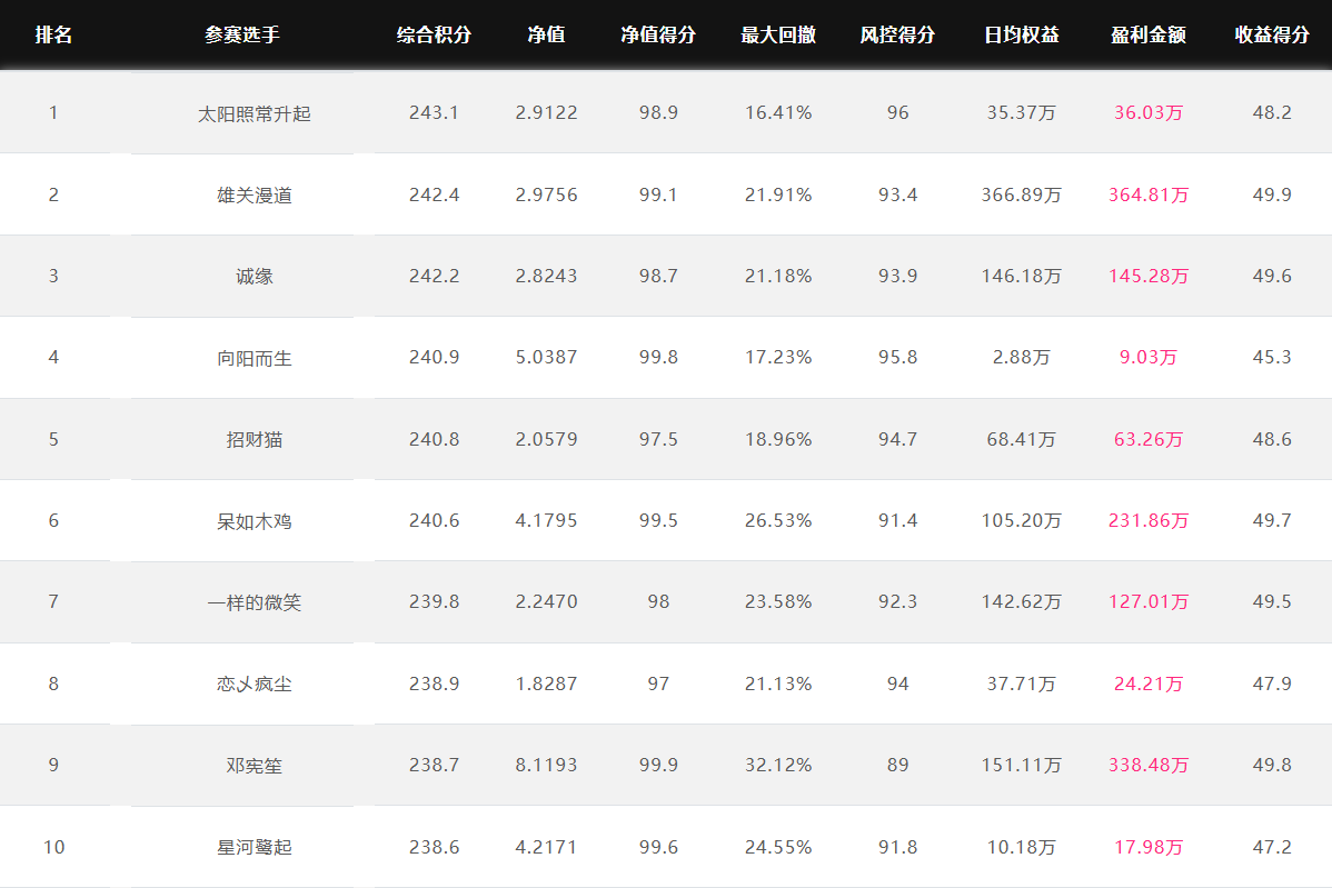 奖金上不封顶 特定期货公司参赛奖金翻倍 优秀选投 每周选优秀选手对接资金 达标必投 单笔最多给1个亿管理型资金 管理型资金盈利分成20%~70% 免费培训/研报/调研/咨询 诚邀您参赛! 为了促进国内期货市场交易人才的发展和成熟,七禾网举办本次“期货CTA英雄联盟”实盘大赛&超级服务,招募优秀的操盘手,为优秀的交易人才搭建桥梁! 第四届大赛圆满结束,第五届荣耀开启,欢迎参赛!第五届大赛已于2025年7月1日开赛,火热报名中,比赛过程中持续接受报名,大赛奖金&管理型资金&超级服务,等你来领! 2023年2月16日后,在主办方指定的几家期货公司中的某一家C公司新开户参赛,享奖金翻倍! 在主办方指定的几家期货公司中的某一家B公司新开户参赛,享奖金翻倍! 大赛中的优秀选手,只要在大赛中有3个月及以上的实盘业绩,主办方将每周发送优秀参赛者的业绩、资料给合作的数十家资方,供其考察是否投管理型资金。至2022年8月12日,资方已选出23名优秀投顾,累计投入超5.5亿元管理型资金。 优秀选投:通过主办方及资方考核后,将获得管理型资金(资金来源:七禾网自有资金(买优秀选手的基金产品)、七禾网股东、数十家合作资方) 在主办方指定的几家期货公司中的某一家B公司新开户参赛,以及2023年2月16日后,在主办方指定的几家期货公司中的某一家C公司新开户参赛,可以按照:“达标必投”进行考核(将给予单笔100万元~1亿元的管理型资金,分红比例20%~70%),详细规则请联系微信:15858201632 大赛综合排名前10名 2026.2.26