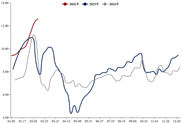 图为全国饲料企业豆粕物理库存可用天数 下游库存方面,截至2月13日,全国饲料企业豆粕物理库存天数为12.59天,较上一期增加0.22天,较去年同期大幅增加4.84天。 综合来看,3月中旬前大豆到港偏低的局面,难以推动豆粕现货基差大幅上涨;3月中旬后,现货基差仍将面临承压态势,豆粕主力期货盘面上行空间有限,不过,2700元/吨的底部支撑相对稳固。 责任编辑:七禾小编 |