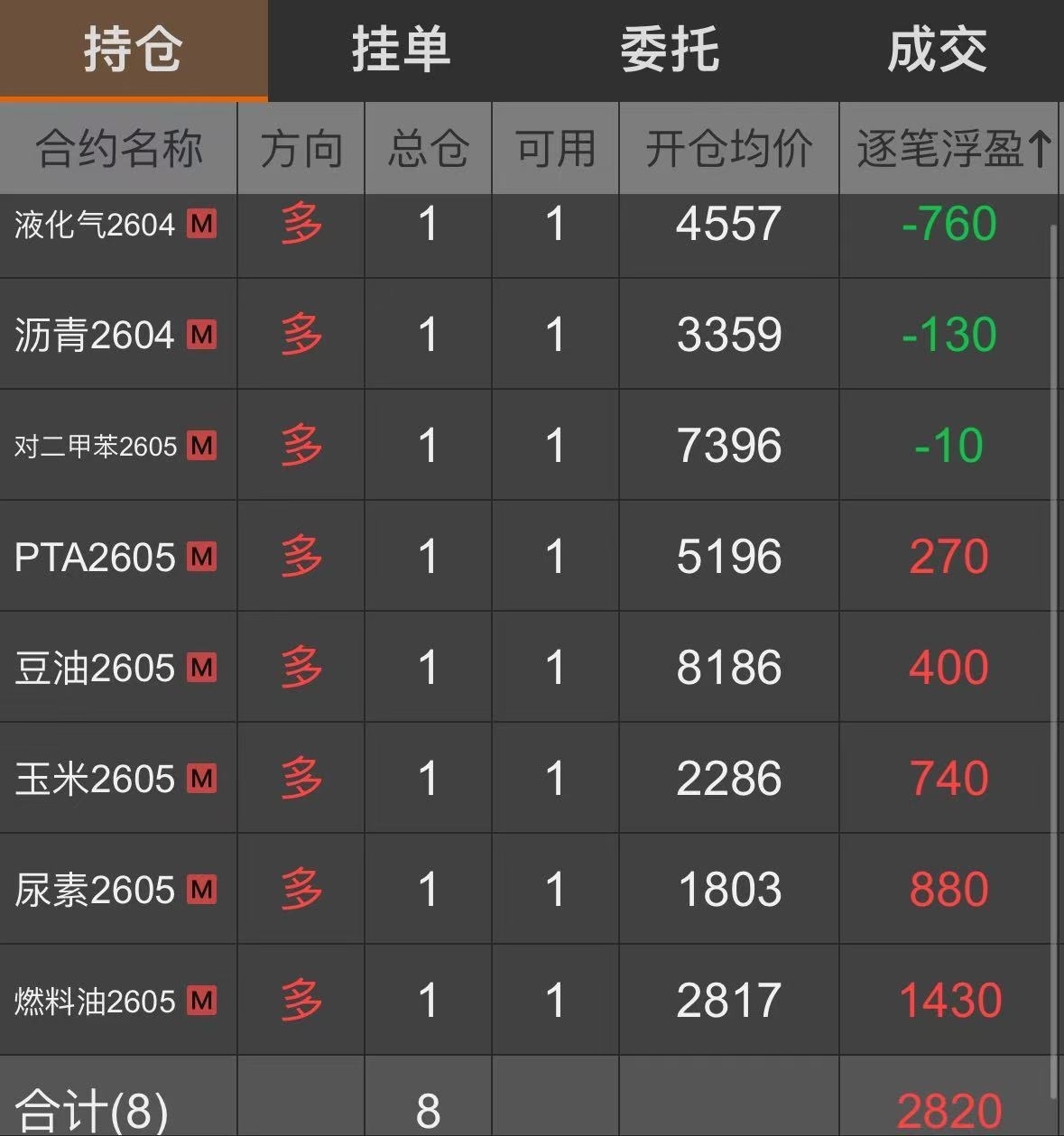 | 一、开仓总结 燃料油:2026年1月9日,达到启动点的开仓条件,所以在14:56开多一手燃料油2603合约,开仓价为2514。燃料油2603合约于2026年2月5日21:35移仓至主力合约2605,开仓价为2817。 PTA:2026年2月10日,达到启动点的开仓条件,所以在14:53开多一手PTA2605合约,开仓价为5230。 玉米:2026年2月10日,达到启动点的开仓条件,所以在14:53开多一手玉米2605合约,开仓价为2286。 尿素:2026年2月11日,达到启动点的开仓条件,所以在14:42开多一手尿素2605合约,开仓价为1803。 丙烯:2026年2月24日,达到启动点的开仓条件,所以在14:49开多一手丙烯2605合约,开仓价为6330。 红枣:2026年2月24日,达到启动点的开仓条件,所以在14:50开多一手红枣2605合约,开仓价为8820。 纯苯:2026年2月24日,达到启动点的开仓条件,所以在14:51开多一手纯苯2603合约,开仓价为6190。 沥青:2026年2月25日,达到启动点的开仓条件,所以在14:50开多一手沥青2604合约,开仓价为3359。 豆油:2026年2月26日,达到启动点的开仓条件,所以在14:45开多一手豆油2605合约,开仓价为8186。 液化气:2026年2月26日,达到启动点的开仓条件,所以在14:45开多一手液化气2604合约,开仓价为4557。 对二甲苯:2026年2月27日,达到启动点的开仓条件,所以在14:53开多一手对二甲苯2605合约,开仓价为7396。