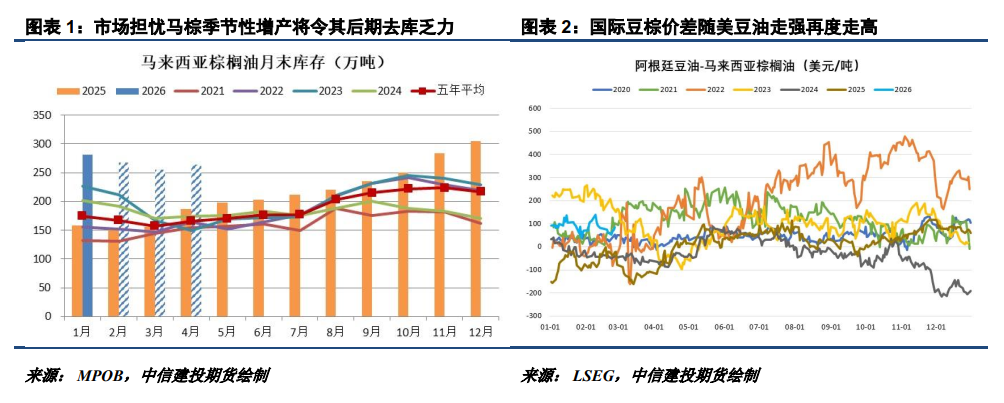 | 在伊朗局势担忧及美国生柴题材提振下,春节期间原油及美豆油强势走高,提振节后内盘油脂自节前低点反弹。随着本周EPA将2026-2027年的生物燃料掺混义务终案提交白宫审议,更多方案细节流出,不确定性减少令美豆油获得更多资金青睐,美豆油站稳60美分后一路高歌,对CBOT大豆及连豆油亦形成带动。然而,棕榈油跟涨稍显吃力,印度今年斋月备货不及预期令马棕2月出口转弱明显,加剧市场对开斋节后棕榈油季节性增产及需求转弱引致的去库乏力担忧,马棕油与美豆油的大幅分化亦带来国内豆油与棕榈油走势的冰火两重天。 一、美国生柴政策落地临近,美豆油上行趋势走出 在本周EPA向白宫提交RVO终案文件后,更多方案细节流出。市场预计EPA将暂不对进口原料生产的生物燃料的RINs进行减半计算,但将以加仑数来制定对生物质柴油的掺混义务,且EPA可能重新分配50%以上的小炼厂豁免额度给大炼厂,与此前路透援引知情人士消息的报道一致。尽管如此,随着政策公布时间越来越近,不确定性减少吸引更多新入场资金,仍提振美豆油一路高歌猛进。 EPA于本周三向白宫预算和管理办公室(OMB)提交2026-2027年的生物燃料掺混义务终案,审批流程一般为4周左右,保守预期为最终方案在3月底出炉。不过,白宫在EPA向OMB提交文件之前就已介入,由于各方信息基本一致,流程可能会加快,市场预期最快在3月9日当周将有消息,这令美豆油市场多头氛围进一步聚集。根据我们此前测算,若当前市场预期兑现, 2026年美国生柴的油脂投料需求有望落在2000万吨以上,同比大增600-800万吨,将带动美豆油升至60-65美分甚至更高区间,并将逐渐对海外油脂市场形成外溢。 对于连豆油来说,外溢路径为美豆油→美豆→连豆油,主要通过进口成本传导实现;对于连棕榈油来说,外溢路径为美豆油→南美豆油→东南亚棕榈油→连棕榈油,为出口竞争传导;对于菜油来说,随着中加关系好转且加菜籽恢复对华出口,外溢路径美豆油→加菜籽→郑菜油也已恢复通畅。相对来看,美豆油上涨的传导对棕榈油和菜油更明显,不过,因棕榈油及菜油各自存在一些基本面的问题,短期反而是豆油表现相对较强。 二、马棕2月预期去库,但市场提前交易开斋节后供需双杀 今年印度斋月备货的动静不大,虽进口商预期1月棕榈油进口大增,2月随棕榈油盘面及报价大跌印度采购再度陷入沉寂。2月19日印度已正式进入斋月,今年开斋节在3月20日。过去两年棕榈油在开斋节后均录得明显下跌,市场担忧后续棕榈油季节性增产及需求转弱带来的供需双杀,存在一定的做空抢跑意愿。 本周MPOA更新对马棕2月前20日产量预估,环比降12.29%,降幅明显低于SPPOMA此前预估的22.24%,且SPPOMA更新的2月前25日产量降幅预估缩小至16.25%。此外,船运调查机构预计马棕2月前25日出口下降12.11%-16.05%,降幅较前20日有所扩大。按此节奏推算,马棕2月末库存或仅能降至260-270万吨,随着季节性增产期临近,留给马棕去库的时间不太多了,这令棕榈油表现有所承压。