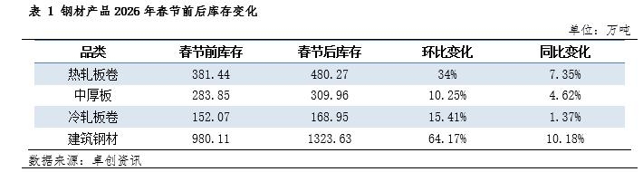 | 春节后钢材库存不同程度增加 春节后钢材产品库存存在季节性增加,具体库存增幅来看,建筑钢材增幅最大,节后库存达到1323.63万吨,较节前增加64.17%,其次增幅较大的为热轧板卷,节后库存在480.27万吨,节前增加34%。冷轧及中厚板分别较节前增加15.41%和10.25%。 建筑钢材节后社会库存总量为854.87万吨,较节前增加202.8万吨增幅31.1%,钢厂库存468.79万吨,较节前增加140.75万吨增幅42.9%。企业库存增幅较大,主要由于冬储资源库存前置,贸易商锁货资源放置在钢厂,后续以直发送到方式流入消耗区域。 热卷春节前后库存累积,节后回归以出货降库存为主要目标,现货价格承压下行。热卷全国均价最新价格为3240元/吨,较上月底热轧板卷全国均价下跌1.04%。热轧板卷最新一期库存水平为480.27万吨,环比上月增加34%,同比提高7.35%;春节假期期间,钢厂维持正常生产节奏,需求则逐步停滞,叠加市场的冬储操作,库存积累速度较快。 节后钢材产品库存均出现增长,特别是建筑钢材和热轧板卷,高库存的压制下,对3月份价格形成一定的压制。