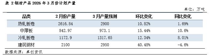 3月份需求或两极分化 热轧板卷需求缓慢复苏:热轧板卷作为重要的中间成品材,其下游需求较为广泛,年后呈现逐步复苏,但市场反馈增速表现一般,节后回归后多以贸易商备货操作较多。冷轧板卷作为热卷的主要下游,随着其产量的增加,一定程度上缓解热卷的供应矛盾,但其他下游恢复缓慢,整体需求呈现缓慢复苏的态势。 中厚板下游需求存较好预期:2026年中厚板存在结构性分化,造船存量订单较多,需求或持续稳定,工程机械随着出口增加,其产量或继续增长,叠加风电行业进入规模化发展,以上两个行业对中厚板需求或存较强的带动。节后下游需求表现尚可,短期以集散地交易量快速回升较为明显,后续关注终端消耗速度。 冷轧板卷需求较为稳定:汽车和家电等主要下游行业的支撑下,需求保持稳定,具备较强韧性。节后冷轧板卷需求快速恢复,节后整体表现强于节前。 建筑钢材需求或疲软:房地产处于调整周期内,其新开工依然偏弱,虽有老旧小区改造,但依旧难以弥补。 3月份价格或板强建弱 3月份预期钢材主要产品均存在销售压力,但整体表现不一,考虑到目前库存、3月份生产情况以及目前需求恢复等三个方面来看,建筑钢材首当其冲,在其高库存、高产量以及需求恢复慢的预期下,现货市场价格或承压;热轧板卷表现次之,目前处于高库存、高产量但需求缓慢恢复,虽短期存在压力,但后续或逐步缓解,价格或先弱后强的走势;中厚板材及冷轧板卷表现相对偏好,目前其库存压力并不算很大,产量虽增加但需求预期及恢复相对较好,其价格或盘整中上行。 (卓创资讯 海敏) 责任编辑:七禾小编 |