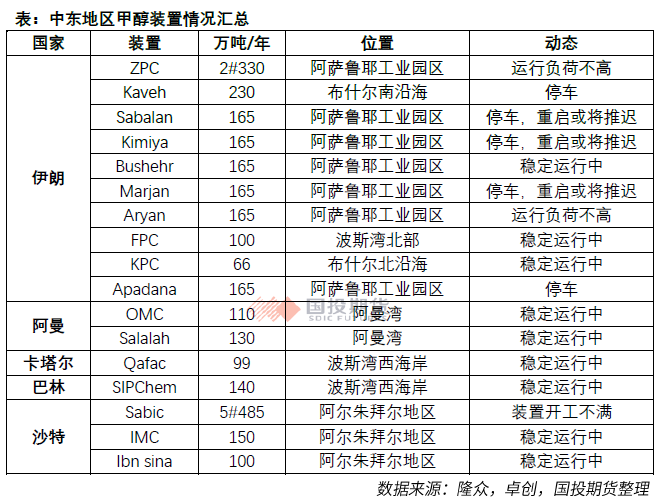 | 周末中东地缘冲突升级,特朗普称对伊朗的军事行动或持续4周,引发市场对来自中东地区甲醇供应中断风险的担忧。周一开盘后甲醇期货主力合约快速触及涨停后延续偏强运行,午后再度涨停,今日收盘2365元/吨,环比上涨176元/吨,涨幅8.04%。 1. 冲突升级对伊朗甲醇装置的影响 伊朗地区甲醇装置年产能1716万吨,有90%以上用于出口,2025年来自该地的进口货源量占我国总进口量的61%,是我国甲醇最主要的进口来源国。截至2月28日,据卓创统计,中东主力区域月度装船量约为27.5万吨,环比减少15.7万吨,跌幅36.3%。 根据目前装置的运行情况来看,伊朗甲醇装置仍在冬季限产的周期内,仅三套装置稳定运行,2月下旬三套检修装置陆续复产,但整体运行负荷不高。前期计划重启的2套总计330万吨产能的装置实际重启时间推迟,整体区域开工维持低位。若中东地缘冲突持续升级,可能导致伊朗甲醇装置复产时间不断延后,甚至运行装置存在停车的可能,我国未来沿海地区甲醇到港量或将持续减少。