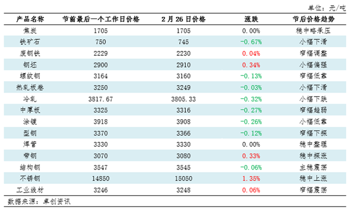 | 报告品种:螺纹钢 原文链接:https://mp.weixin.qq.com/s/aucVKoqkBQ1kt2QoWMgRVw?scene=1&click_id=22 【导语】节后钢材价格跌多涨少,整体窄幅震荡调整为主,市场交投陆续恢复中。春节期间停工企业陆续在正月初八至初十陆续恢复,而下游工地开工不足10%。对于后市,需求预估到3月中下旬复苏到偏正常水平,短期供需不匹配,对价格支撑不足,价格或仍震荡调整为主,但3月上旬的政策仍有向好预期,加上随着需求逐步恢复,市场商家对后市谨慎偏乐观,预计后期价格或呈现震荡调整后反弹趋势。 春节前后钢材价格、企业开工率、企业库存、市场库存均出现明显变化,对于下游终端复工情况和市场心态看法,商家关注度明显增高,卓创资讯节后钢材系列调研汇总,呈现如下: 调研一:节后钢材价格走势:窄幅震荡调整 节后钢材产品价格涨跌不一,整体呈现窄幅震荡调整的走势。其中建材和板材品目基于春节期间长流程钢厂仍维持生产,供应压力增加,同时市场心态偏谨慎,节后呈现小幅低靠走势。钢坯、带钢等品目受市场消息面偏强预期带动,价格呈现先弱后强,整体小幅高靠。从调整幅度来看,除不锈钢外,其他品种节后价格调整幅度均在1%以内,不锈钢在原料成本持续推升和消息面利多提振市场心态带动下,节后价格涨幅较明显,较节前涨幅1.35%。