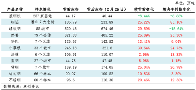 调研四:节后钢材市场库存:继续累库,多较去年同期偏高 据卓创资讯调研得知,节后钢材品种市场库存呈现季节性增加为主,主流较节前增幅10%-30%。库存较去年同期相比,除螺纹钢和废钢铁较去年同期库存偏低外,其他钢材品种市场库存较去年同期均偏高,较去年库存高6%-27%不等。其中钢坯仓储库存增幅明显,因春节期间高炉生产相对正常而调坯企业多停产,供增需弱,库存增幅明显,较去年库存高85%,库存压力较大。而螺纹钢库存较去年同期跌的原因是贸易商对市场信心不足,备货意愿减少,加上随着直发比例增加,部分锁价资源也放到厂库,导致市场库存较去年偏低。