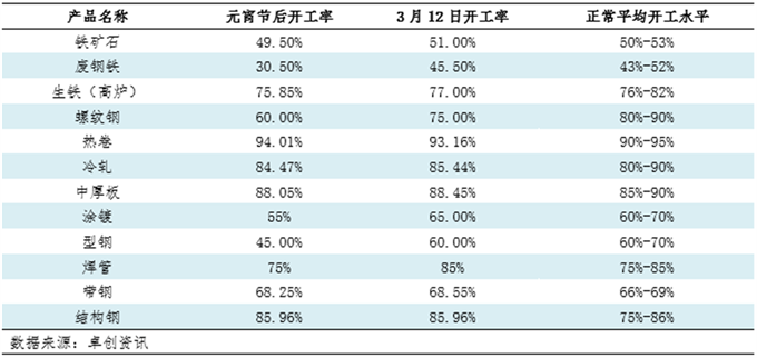 调研二:节后钢厂复工进度:长流程春节期间维持正常,短流程陆续恢复 据卓创资讯调研得知,春节期间长流程产品企业(生铁、板材)开工率维持在75%-95%正常水平,调坯企业和短流程产品企业(部分型钢、带钢、涂镀、螺纹钢和焊管)春节期间停产,多数焊管和涂镀企业于正月初八至初十陆续复产,而调坯企业(型钢、带钢、螺纹钢)目前复产不多,计划3月上旬陆续复产。
