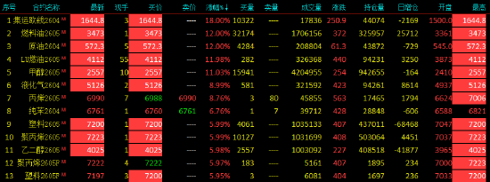 | 2026年3月3日,国内期货主力合约涨多跌少,集运欧线、燃油、SC原油、低硫燃料油(LU)、甲醇、液化石油气(LPG)、塑料、聚丙烯(PP)、乙二醇(EG)均触及涨停,丙烯涨超8%,纯苯涨近7%,PX0>对二甲苯(PX)、苯乙烯(EB)、沥青涨近5%,苹果、焦煤涨超4%。跌幅方面,碳酸锂、沪锡触及跌停,沪银跌超9%,铂跌超8%,钯跌超6%。