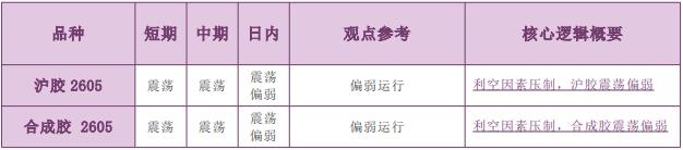 备注: 1.有夜盘的品种以夜盘收盘价为起始价格,无夜盘的品种以昨日收盘价为起始价格,当日日盘收盘价为终点价格,计算涨跌幅度。 2.跌幅大于 1%为弱势,跌幅 0~1%为偏弱,涨幅 0~1%为偏强,涨幅大于1%为强势。 3.偏强/偏弱只针对日内观点,短期和中期不做区分。 主要品种价格行情驱动逻辑—商品期货能源化工板块 沪胶(RU) 日内观点:震荡偏弱 中期观点:震荡 参考观点:偏弱运行 核心逻辑:上周末,中东地区爆发美伊军事冲突,地缘风险快速升温,伊朗宣布封锁霍尔木兹海峡,原油等能源物资无法从中东向外运输,原油期货价格大幅高开。随着油价大幅上涨,通胀预期回升,全球央行降息周期可能提前结束,或迎来加息周期,流动性趋紧预期增强,叠加新一轮割胶期临近。在偏空因素压制下,本周二夜盘国内沪胶期货 2605 合约呈现震荡下行的走势,期价大幅收低。预计本周三国内沪胶期货 2605 合约或维持震荡偏弱的走势。 合成胶(BR) 日内观点:震荡偏弱 中期观点:震荡 参考观点:偏弱运行 核心逻辑:上周末,中东地区爆发美伊军事冲突,地缘风险快速升温,伊朗宣布封锁霍尔木兹海峡,原油等能源物资无法从中东向外运输,原油期货价格持续走强。随着油价大幅上涨,通胀预期回升,全球央行降息周期可能提前结束,或迎来加息周期,流动性趋紧预期增强。在利空隐患出现的背景下,本周二夜盘国内合成橡胶期货 2605 合约续涨乏力,收敛涨幅。预计本周三国内合成橡胶或维持震荡偏弱的走势。 责任编辑:七禾小编 |