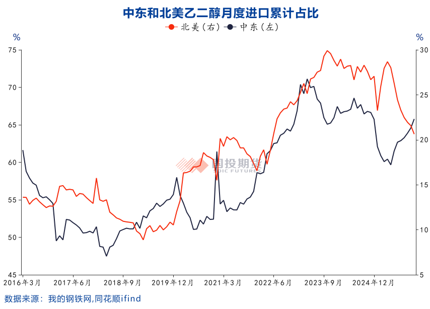 对抗升级引发进口下滑担忧 2025年我国乙二醇进口量772万吨,占国内表观消费量的28%。其中,自沙特进口量422.6万吨,约占我国乙二醇总进口量的55%,自伊朗进口量为7万吨,占比不足1%,另外科威特、阿联酋和阿曼等中东地区均有乙二醇出口至我国,整体看我国自伊朗直接进口量不大,但中东地区进口的乙二醇总量超500万吨,占比约66%。
